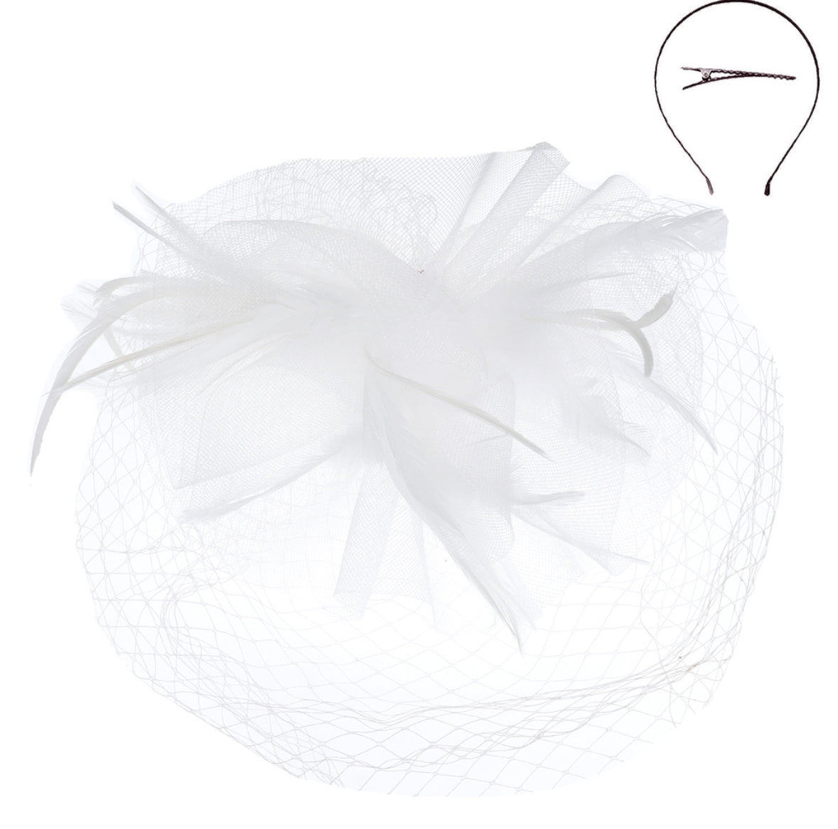 3-PIECE KENTUCKY DERBY SOUTHERN STYLE VEILED MESH FEATHERED DECORATIVE HEADPIECE FASCINATOR *** DETACHABLE HEADBAND, INCLUDES HEADBAND AND CLIP ***