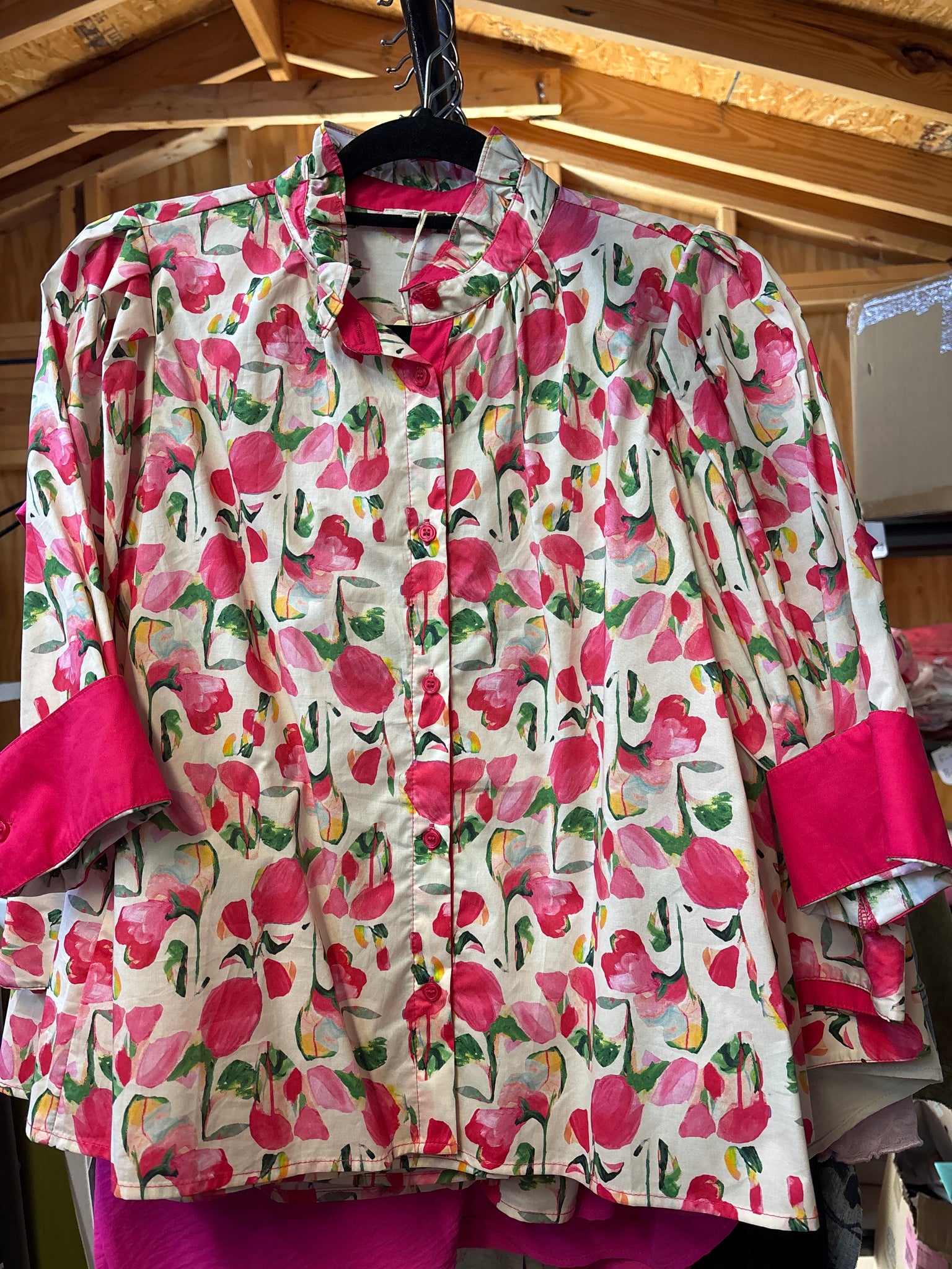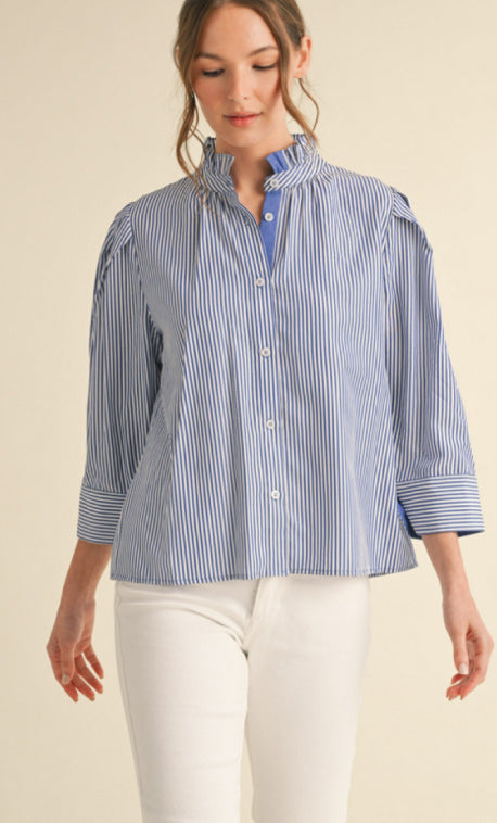 This Striped Top is the perfect balance of sophistication and charm. The stand-up collar with ruffled trim and buttoned closure adds a touch of elegance, while the inversed pleat and tucked sleeves create a flattering silhouette. The lightweight material and slit band cuffs make it ideal for any season.