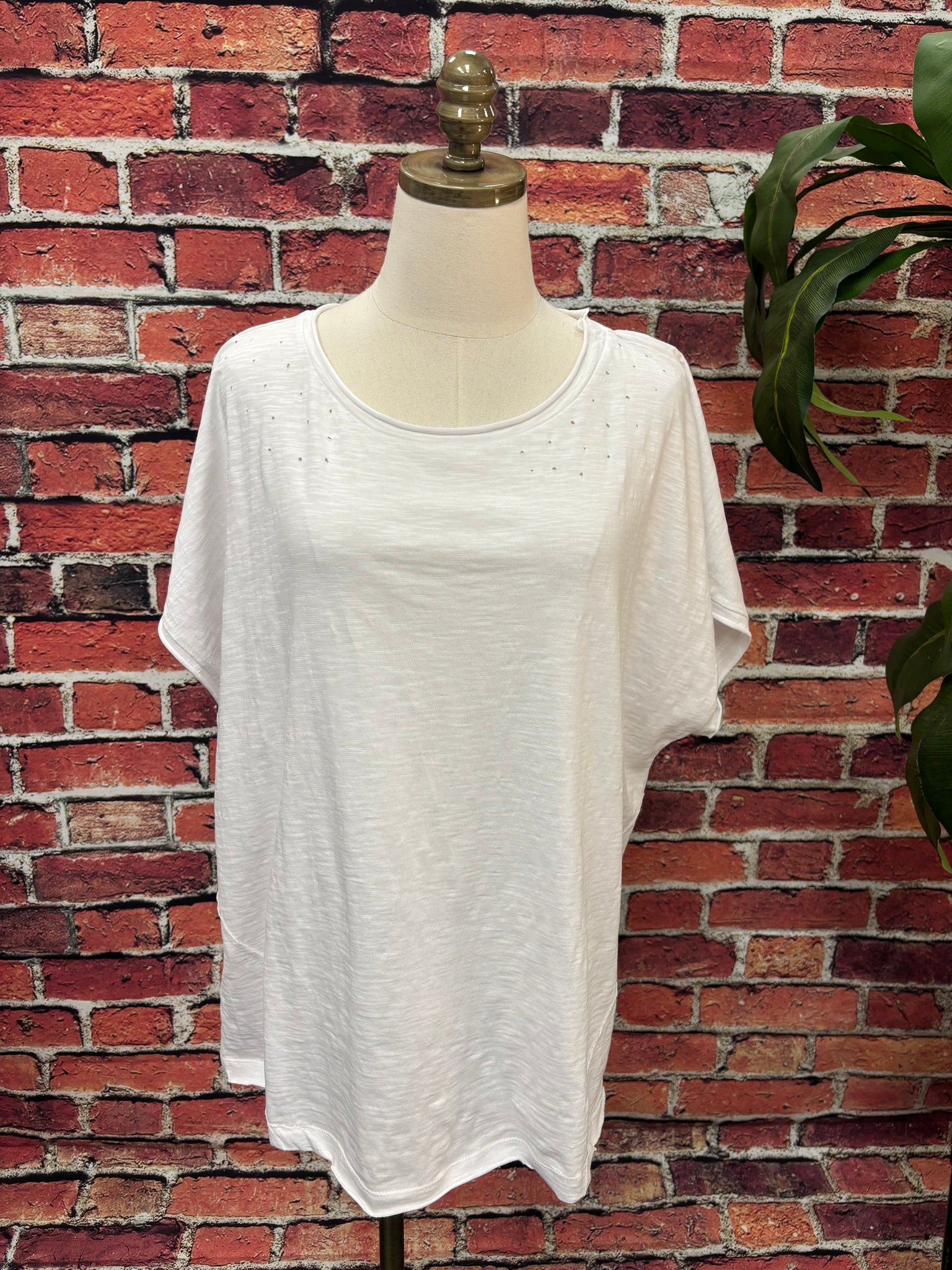 Effortlessly cool with that perfectly worn-in feel ✨ This 100% cotton top features a subtle distressed detail along the neckline and shoulders, giving it that relaxed, lived-in boho vibe we all love.