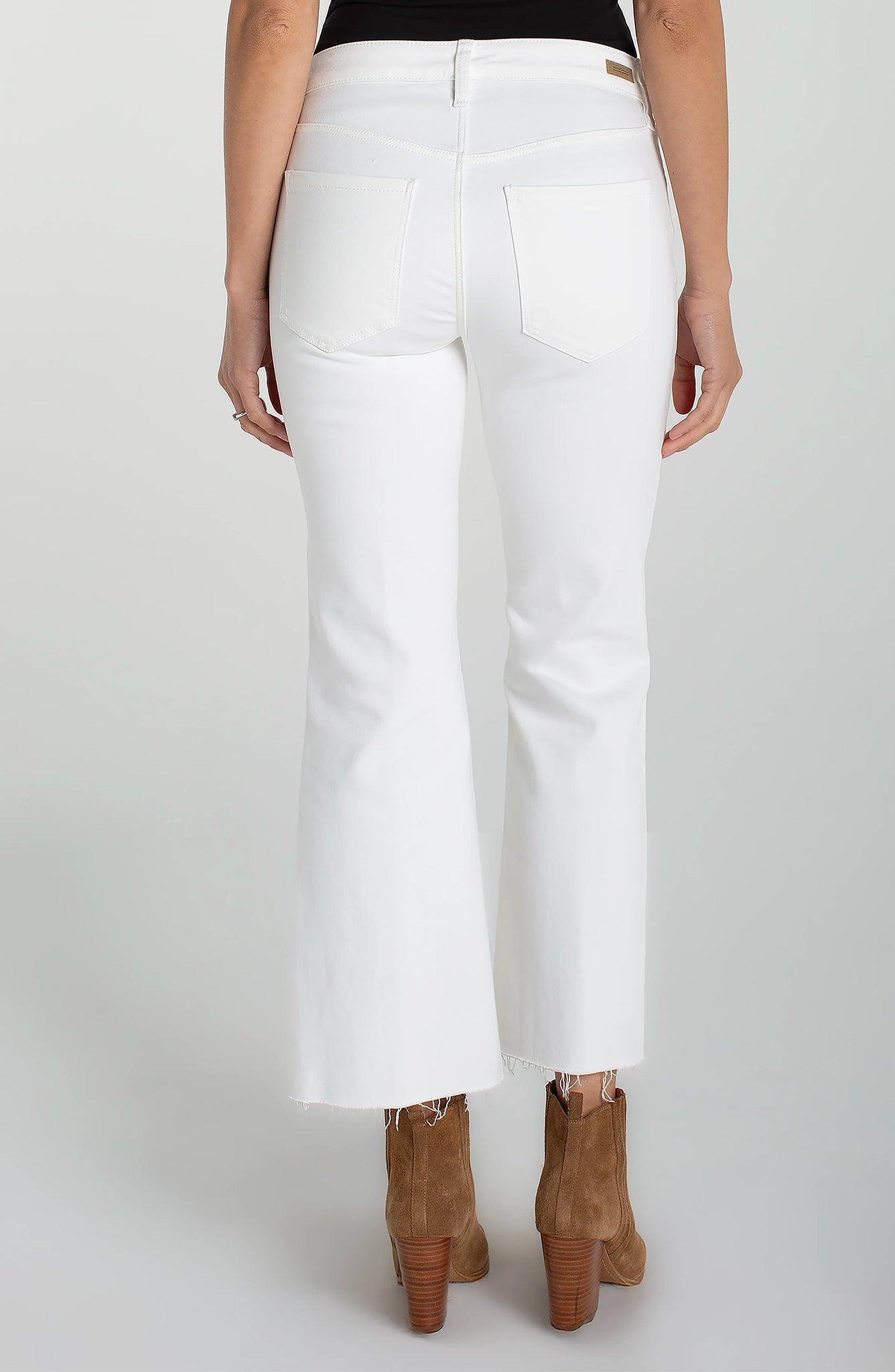 The Hannah Crop Flare brings a fresh twist to a classic silhouette. Designed with a mid rise fit and cropped flare leg, this style is finished with a twisted front slit that adds movement and shape with every step. Crisp bright white keeps the look polished and modern, while classic five pocket styling grounds it for everyday wear.