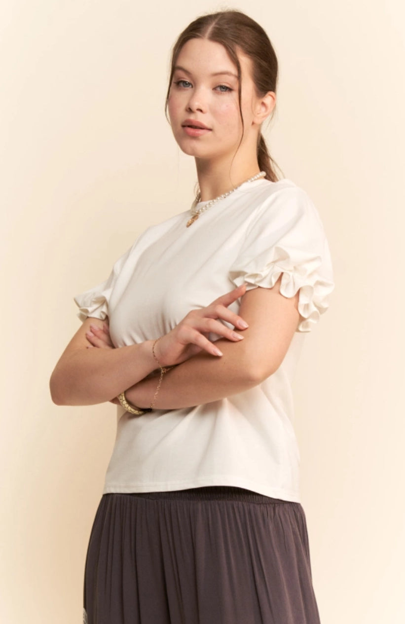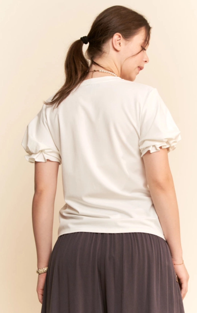 Elevate your essentials with this refined knit top featuring double ruffle sleeves for a feminine touch. Designed for all-day polish and comfort, it pairs effortlessly with trousers or skirts - perfect for boutiques seeking wearable elegance with subtle flair. Available in versatile hues to suit every wardrobe.
