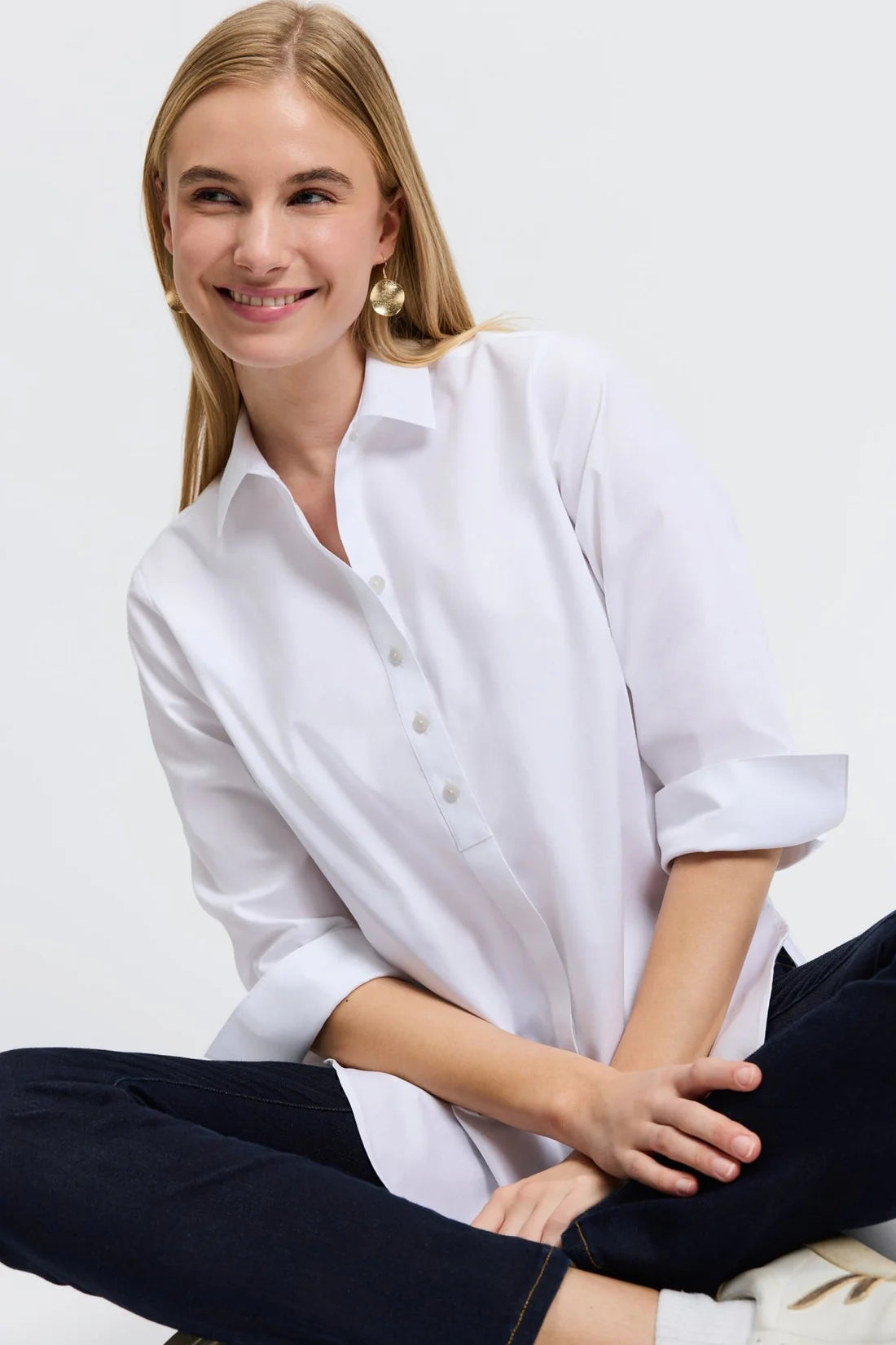 Get the relaxed ease of a popover with the polished presentation of a button-up shirt — both are yours in this new tunic silhouette. The cleverly designed placket conceals half the buttons, giving you the casual look of a henley alongside the functionality of the familiar. Wear the cuffs flat or flipped up to show off our signature triple pleat detail. A back pleat beneath the yoke creates the perfect drape, and a slightly longer hem makes this piece the perfect pick over leggings or straight-leg pants.