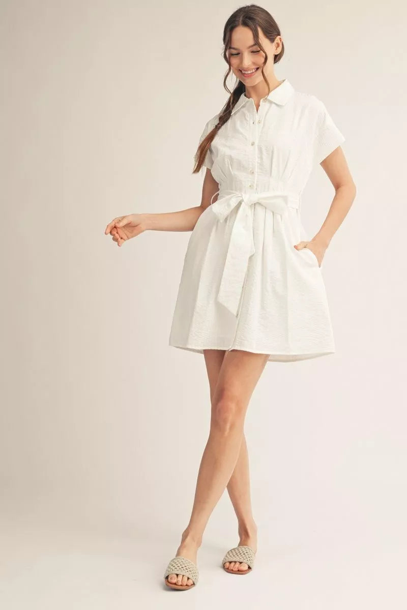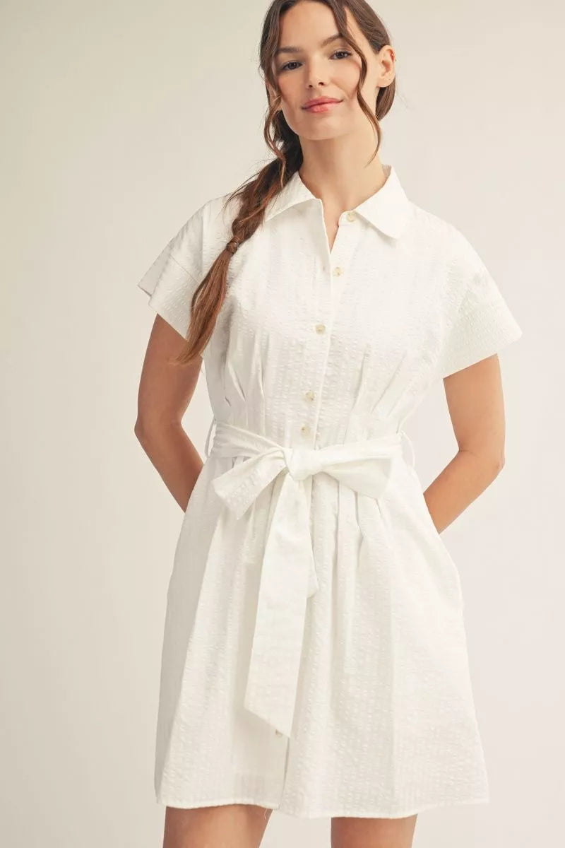 Drop shoulder button down stripe dress with waist tie, side pockets, pintuck waistline detail, textured fabric.