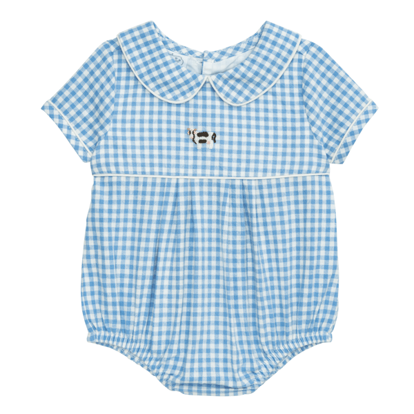 The Farm Gingham Bubble is a charming and stylish outfit perfect for your little one. This adorable piece showcases a classic gingham pattern, adding a touch of timeless elegance to your baby's wardrobe. The French knot icon at the chest provides a delicate and intricate detail, enhancing the overall design. Accent piping adds a refined finish, while the Peter Pan collar offers a sweet and traditional look. Designed with practicality in mind, the inner leg snaps ensure easy diaper changes and dressing. this bubble is crafted with a comfortable blend of materials: the body is made of 65% cotton and 35% polyester, providing softness and durability, while the lining consists of 80% polyester and 20% cotton for added comfort. Ideal for special occasions or everyday wear, this gingham bubble is a must-have addition to your baby's collection.