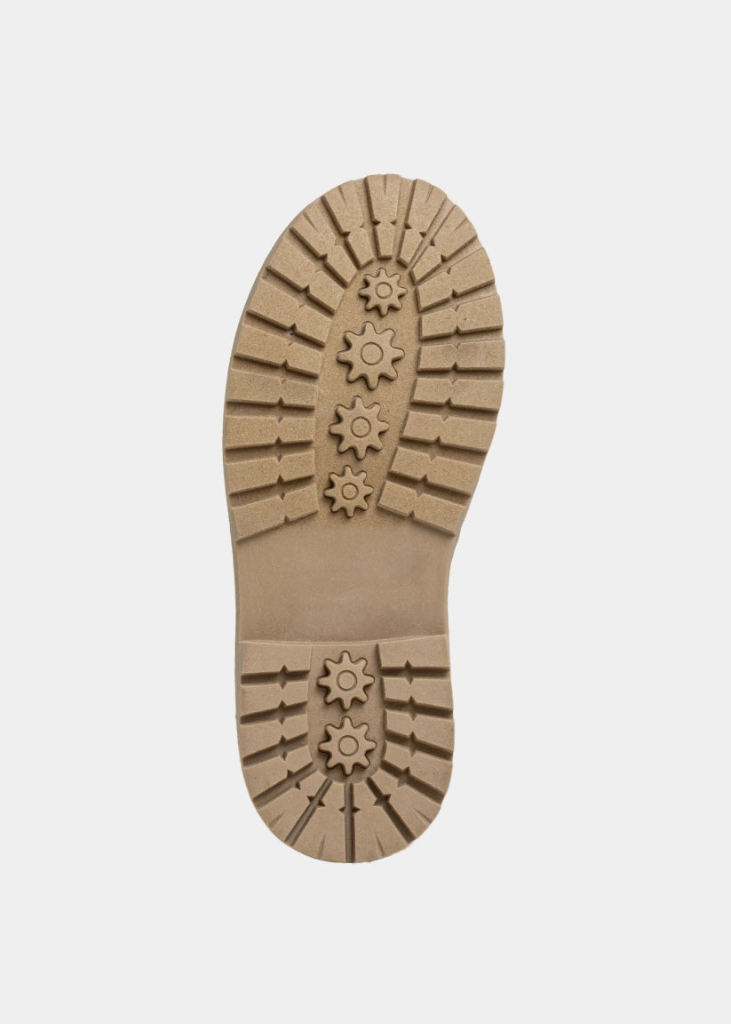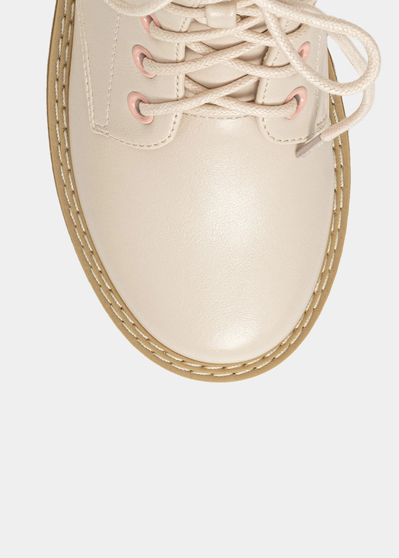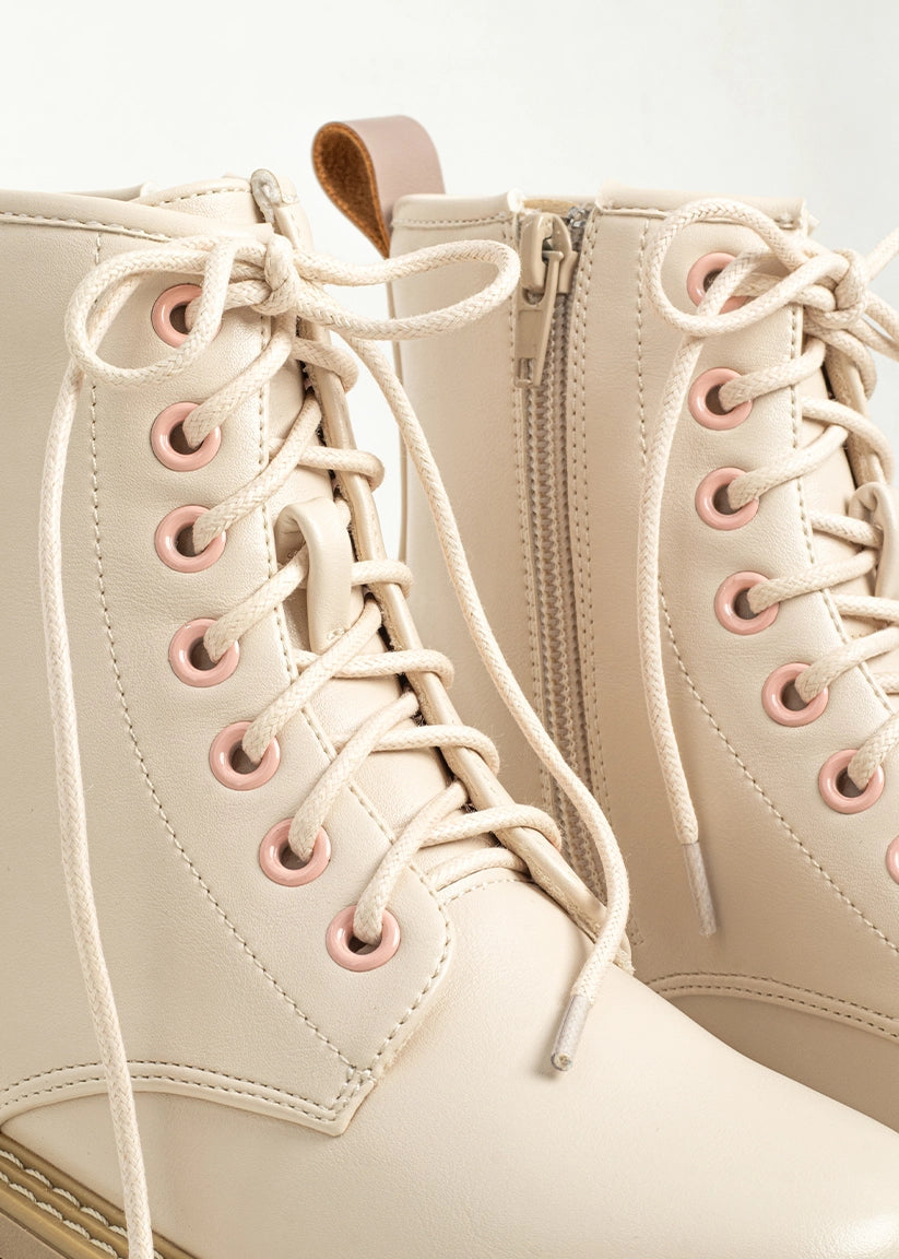 Tough, trendy, and made for little steps. The ZORA MINI BONE brings a soft neutral twist to the combat boot trend. With its creamy faux leather finish and chunky lug sole, this toddler and kids boot is as versatile as it is bold. A side zipper ensures easy wear, while the classic lace-up design keeps it fashion-forward.