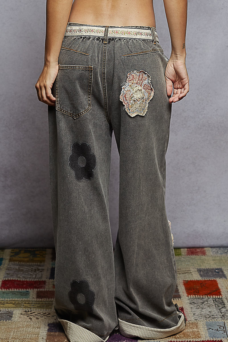 Bring effortless charm to your outfit with these floral patchworks relaxed fit pants crafted in classic denim. Designed for comfort and style, they feature a laid-back silhouette complemented by a stylish rolled-up detail at the hem. Perfect for adding a playful, vintage-inspired touch to any casual outfit.