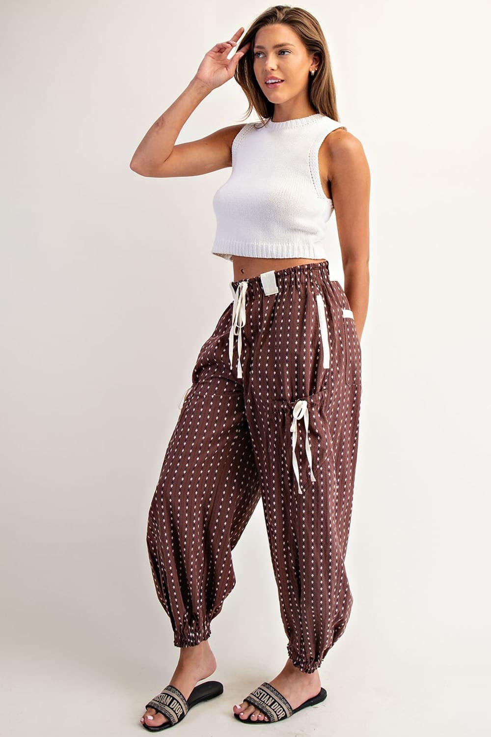 Product Detail: These soft washed pants showcase an allover micro diamond stripe print, elastic waistband with a contrast drawstring, oversized belt loops, side hip pockets, added cargo pockets with a drawstring cinch, back welt pockets, and elasticized cuffs for a relaxed, utility inspired fit.