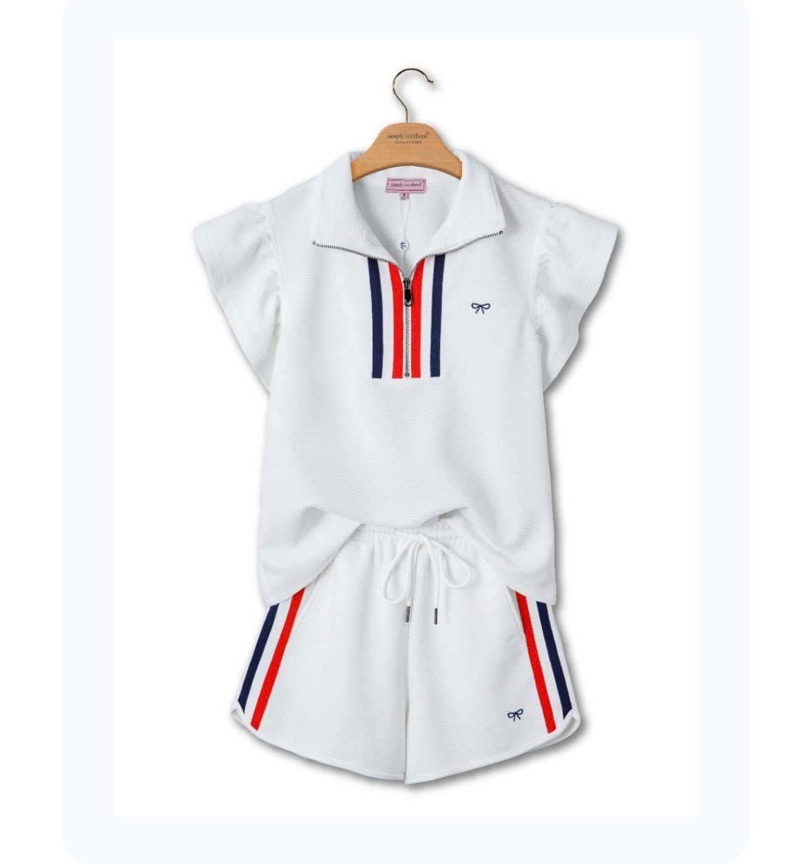 This Americana Set has a top featuring a collared neckline with zip, coordinating trim, and ruffle sleeveless design. The matching shorts feature coordinating trim, elastic waistband with drawcord, and pockets. Made of 95% polyester and 5% spandex.