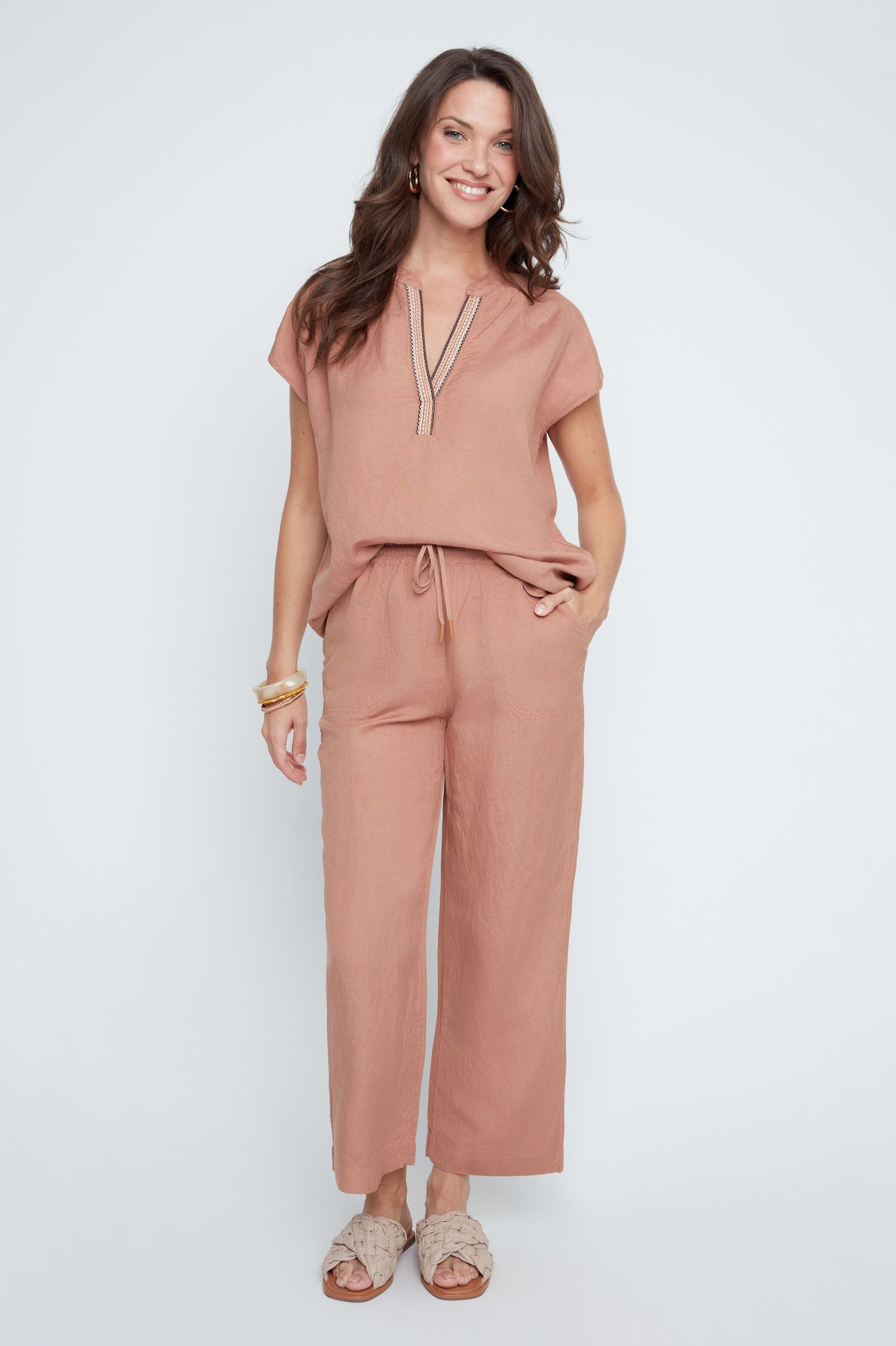 Complete your effortless warm-weather look with these beautifully breezy cropped linen pants. Designed in a soft blush tone, this relaxed silhouette features a comfortable elastic drawstring waist, easy front pockets, and a flattering straight-leg crop that moves with you from day to night.