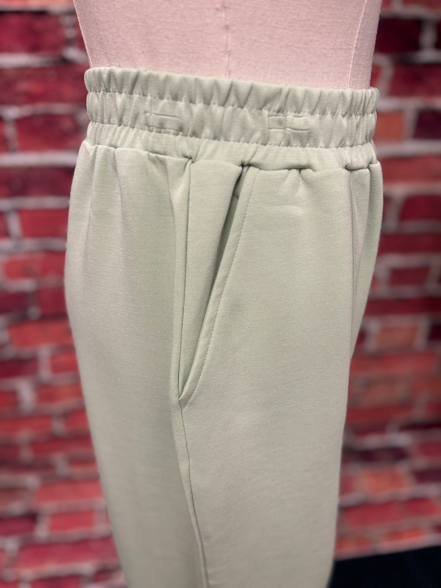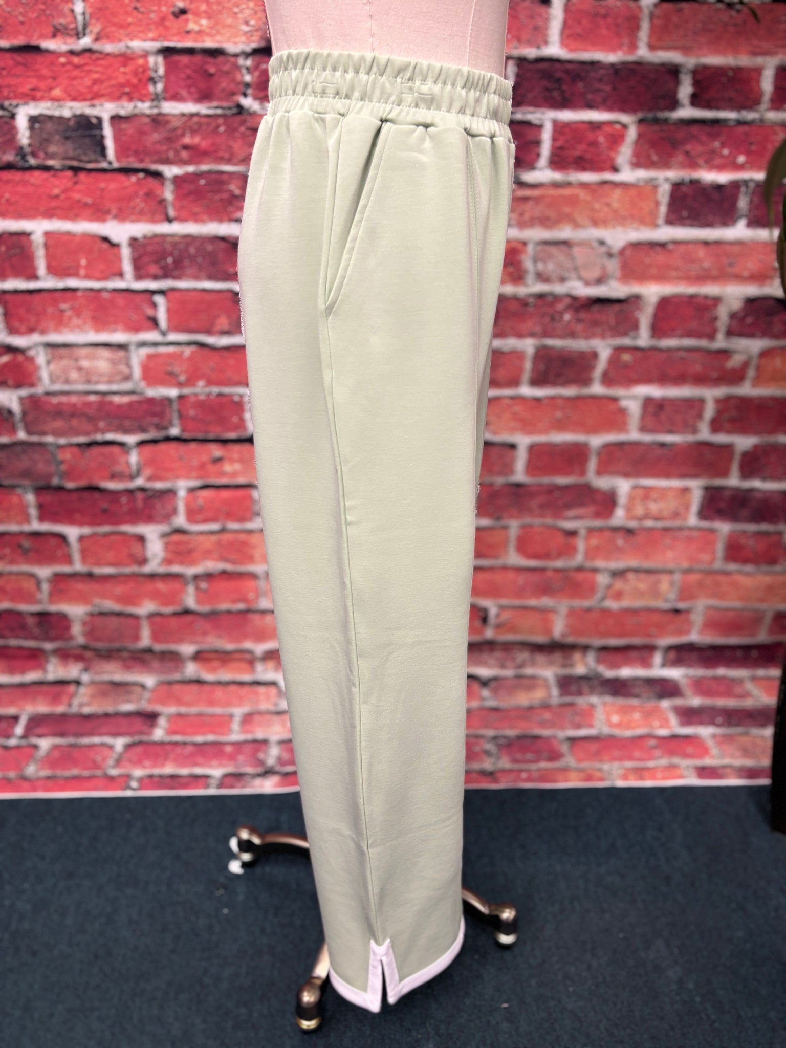 Elevated comfort meets effortless style with these soft sage green lounge pants. Designed with a relaxed straight-leg silhouette, these pants feature an elastic waistband for an easy pull-on fit and subtle seam detailing that elongates the leg. Finished with delicate scalloped hems accented by contrast trim, they bring a polished touch to everyday loungewear.