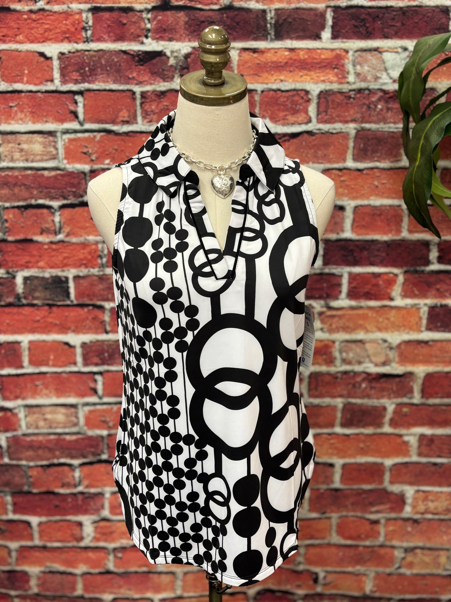 Stay cool, confident, and protected in this bold black and white sleeveless top featuring a striking modern geometric print. Designed with a flattering split neckline and structured collar, this piece blends sporty function with polished boutique style.