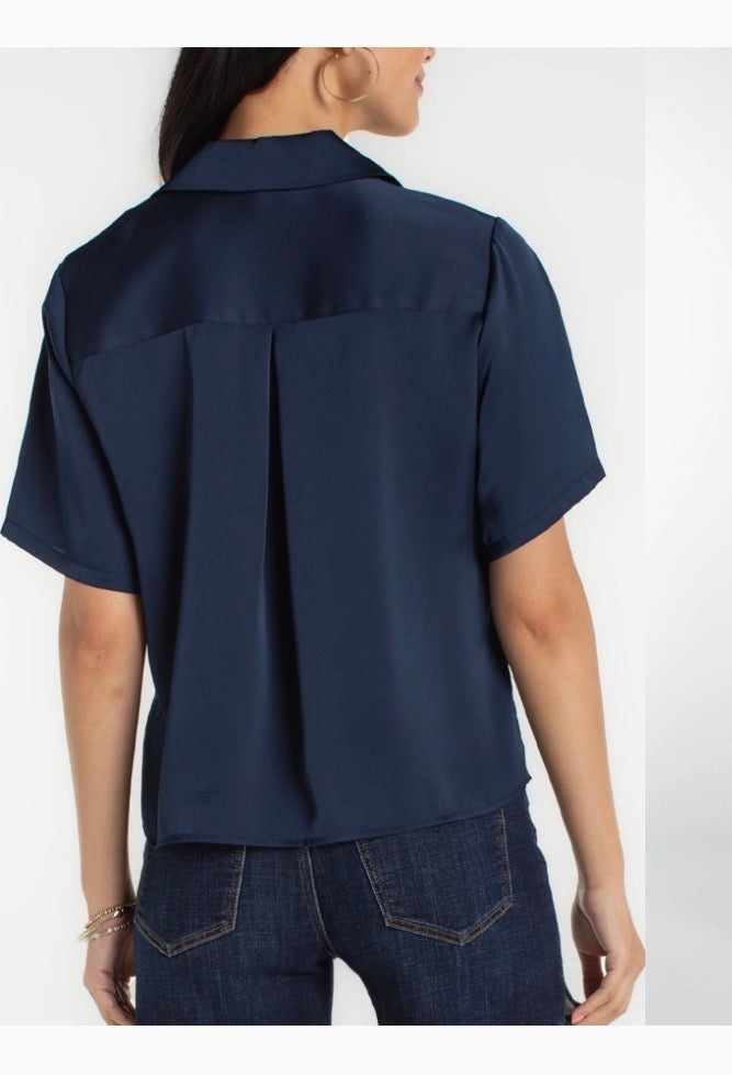 This woven blouse brings a modern twist to a classic camp collar silhouette. The short sleeves and inverted placket create a soft, streamlined shape while the button front keeps the style fresh and versatile.