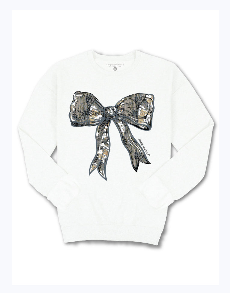 White long sleeve crew with a large bow filled with a tree branch camo pattern. Simply Southern logo alongside.