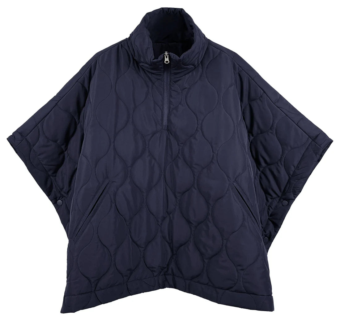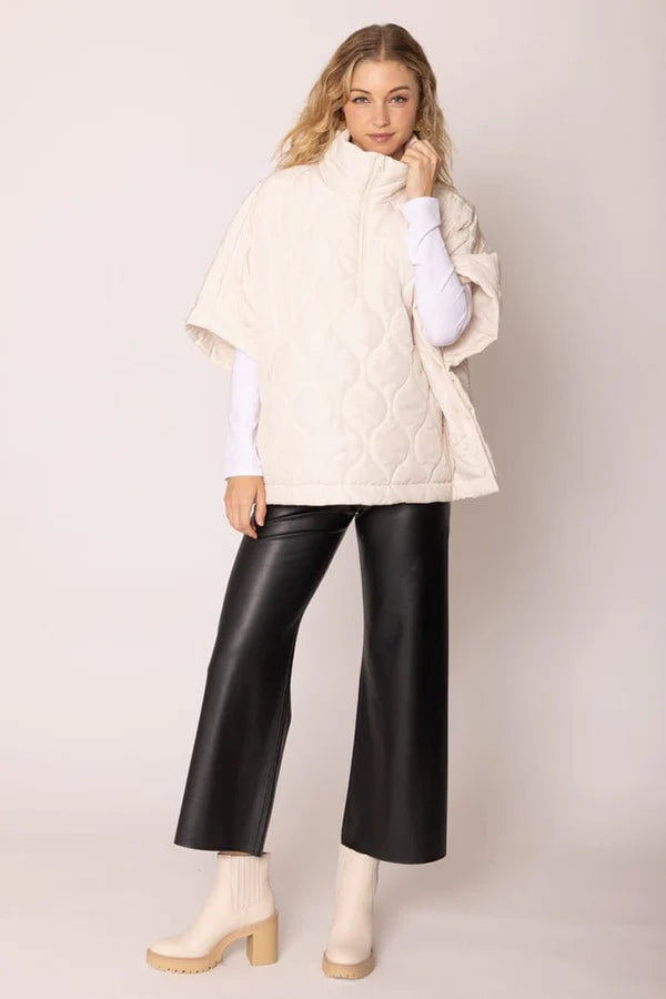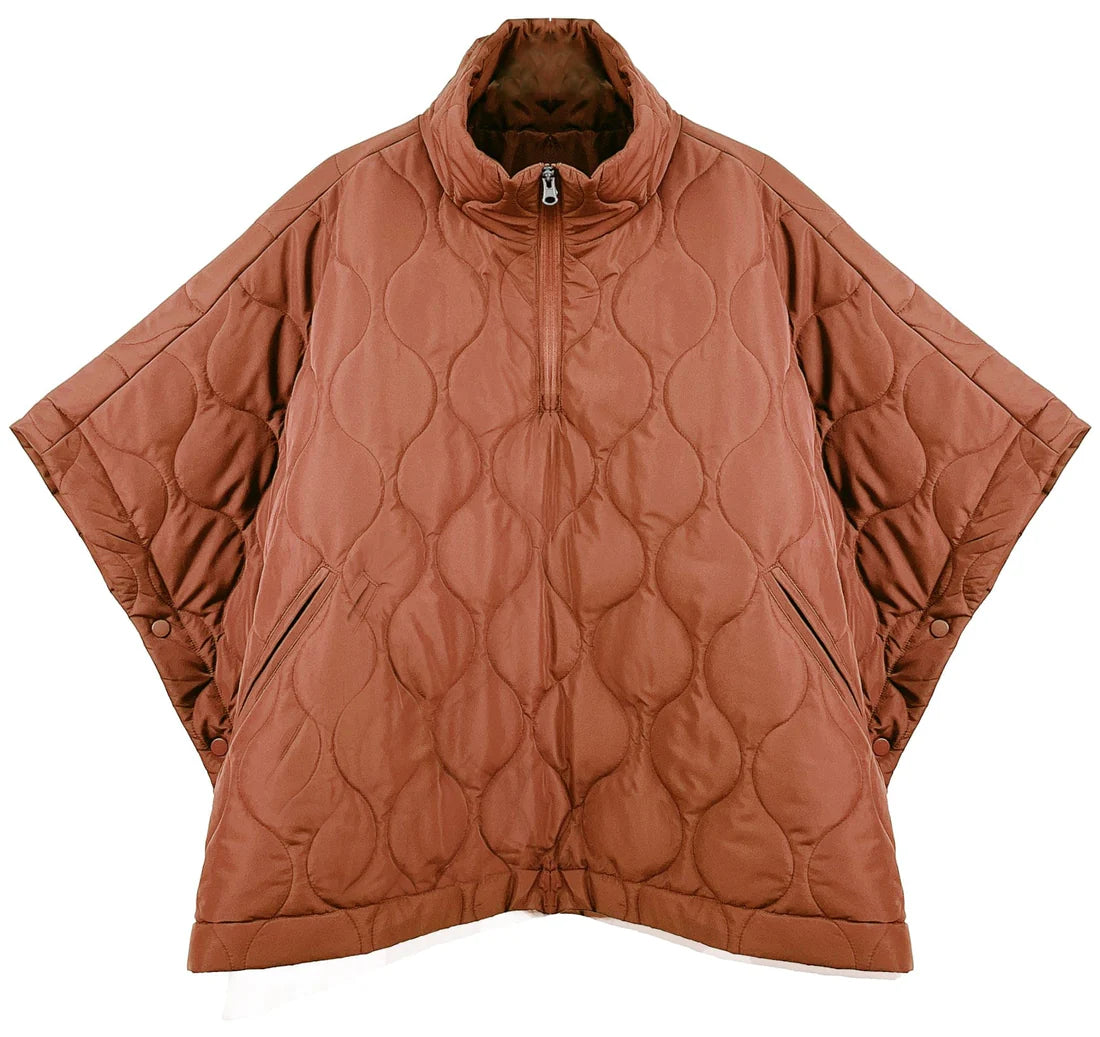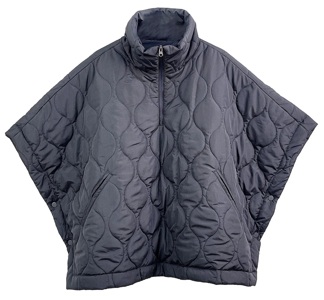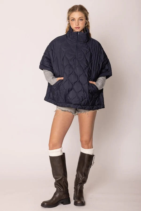 Introducing the Quarter Zip Quilted Puffer Poncho - the perfect combination of style and functionality. This poncho will keep you warm and cozy while also adding a touch of fashion to your outfit. Perfect for any occasion, this poncho is a must-have for any wardrobe.