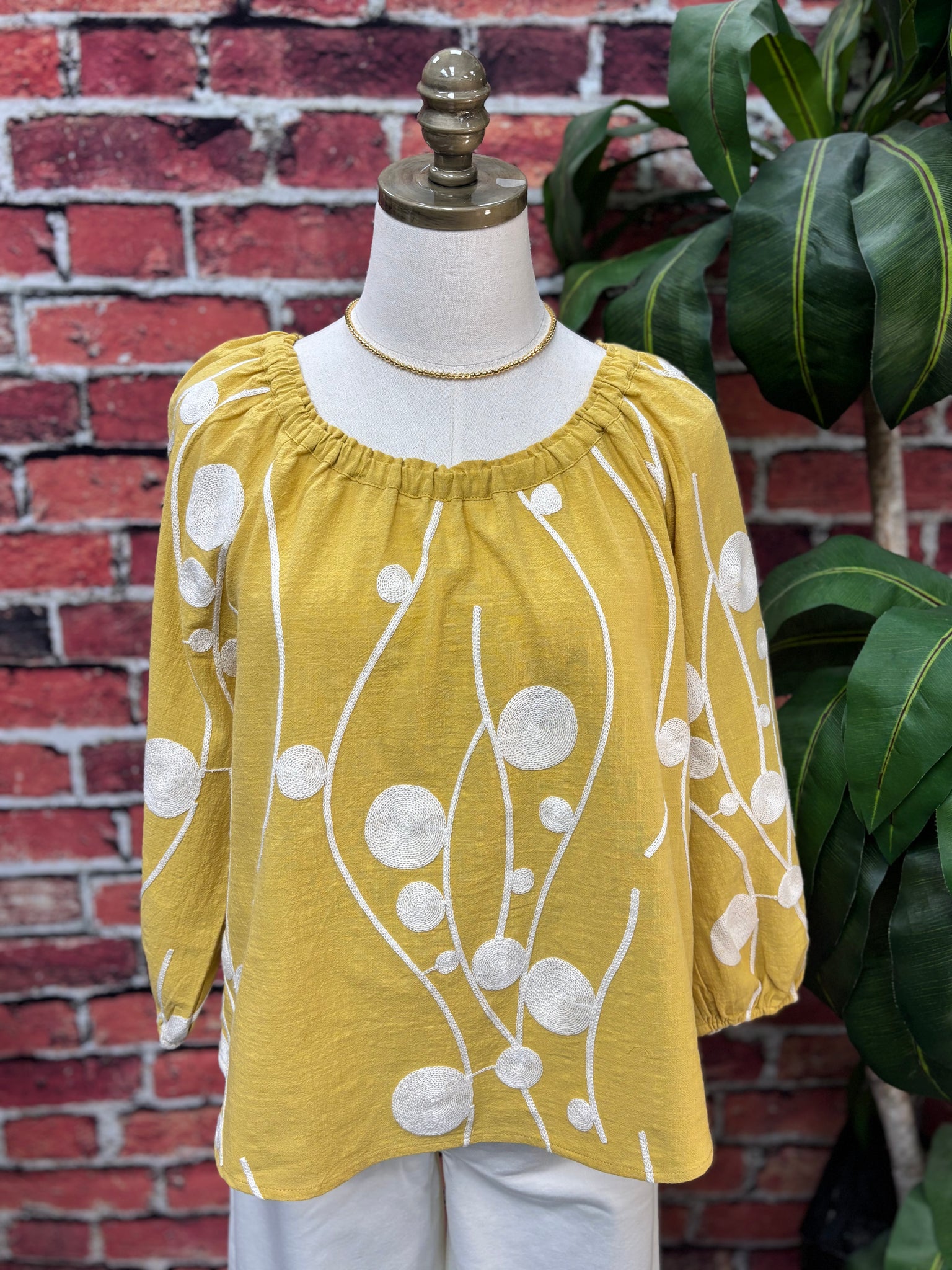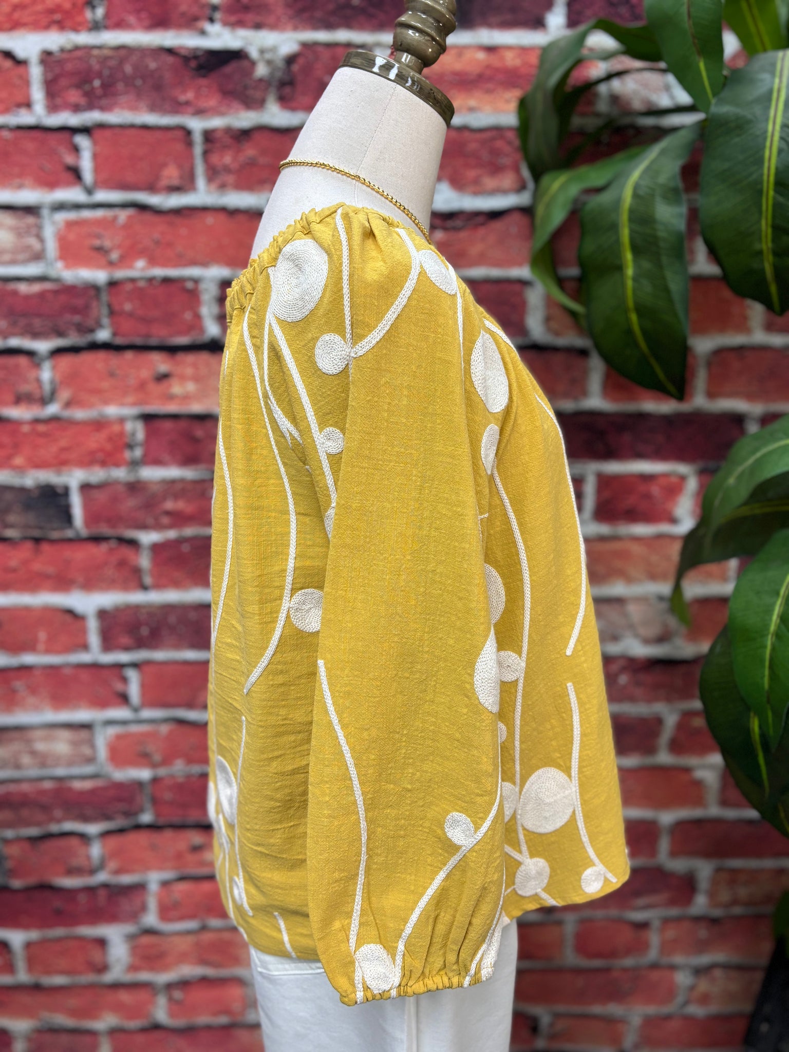 Brighten up your wardrobe with this effortlessly chic statement top ✨ The Golden Garden Embroidered Blouse features a rich golden mustard hue with eye-catching ivory embroidered vine and dot detailing that gives it an artistic, boutique feel. The soft gathered neckline can be worn on or slightly off the shoulder for a versatile, feminine look.