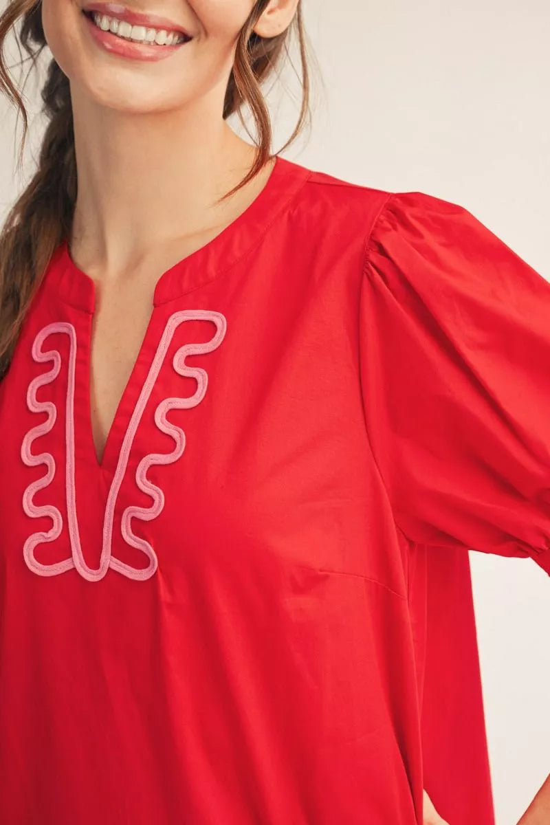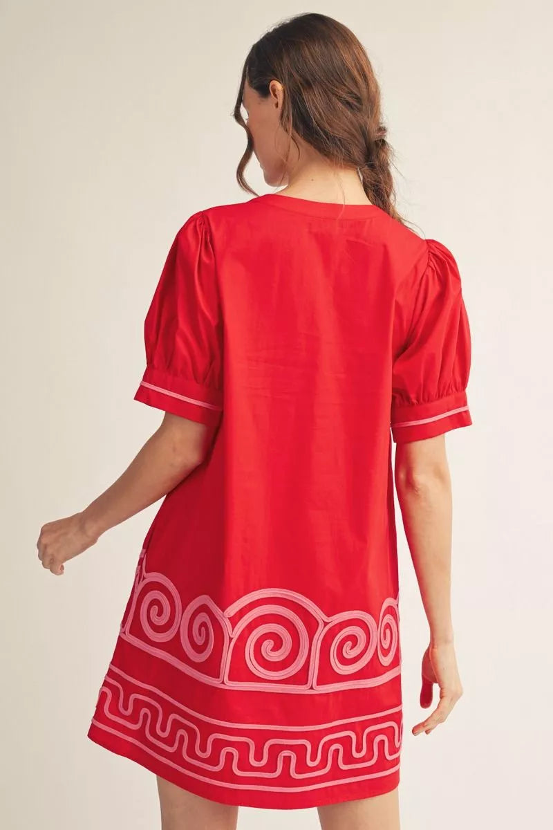 Short puff sleeves applique embroidered shift dress with side pockets.