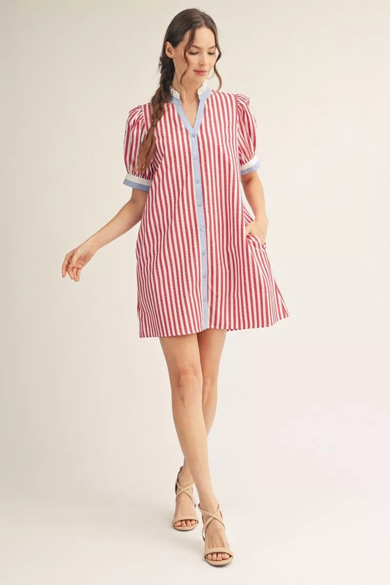The Build This Together Dress is a short puff sleeve shift dress featuring a button-down front, ruffled neckline, and solid contrast detailing. Crafted from a blend of 51% cotton and 49% polyester, it offers durability and comfort. The inclusion of side pockets enhances functionality without compromising style.