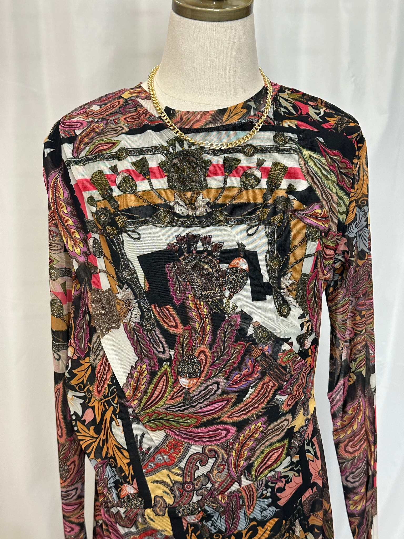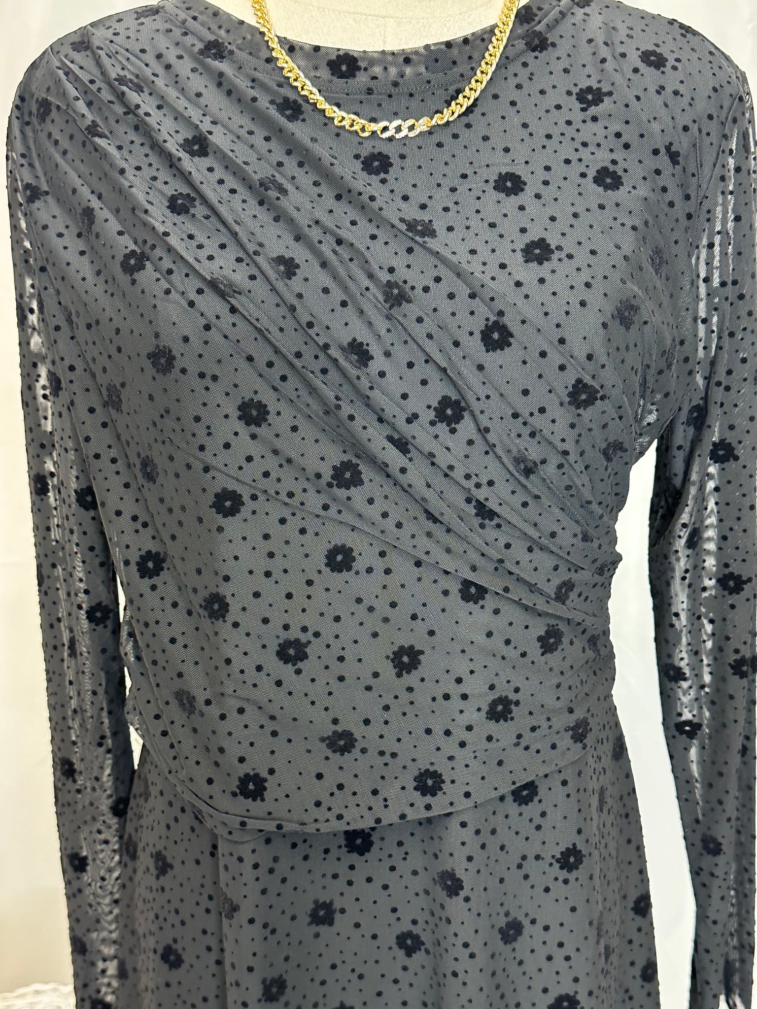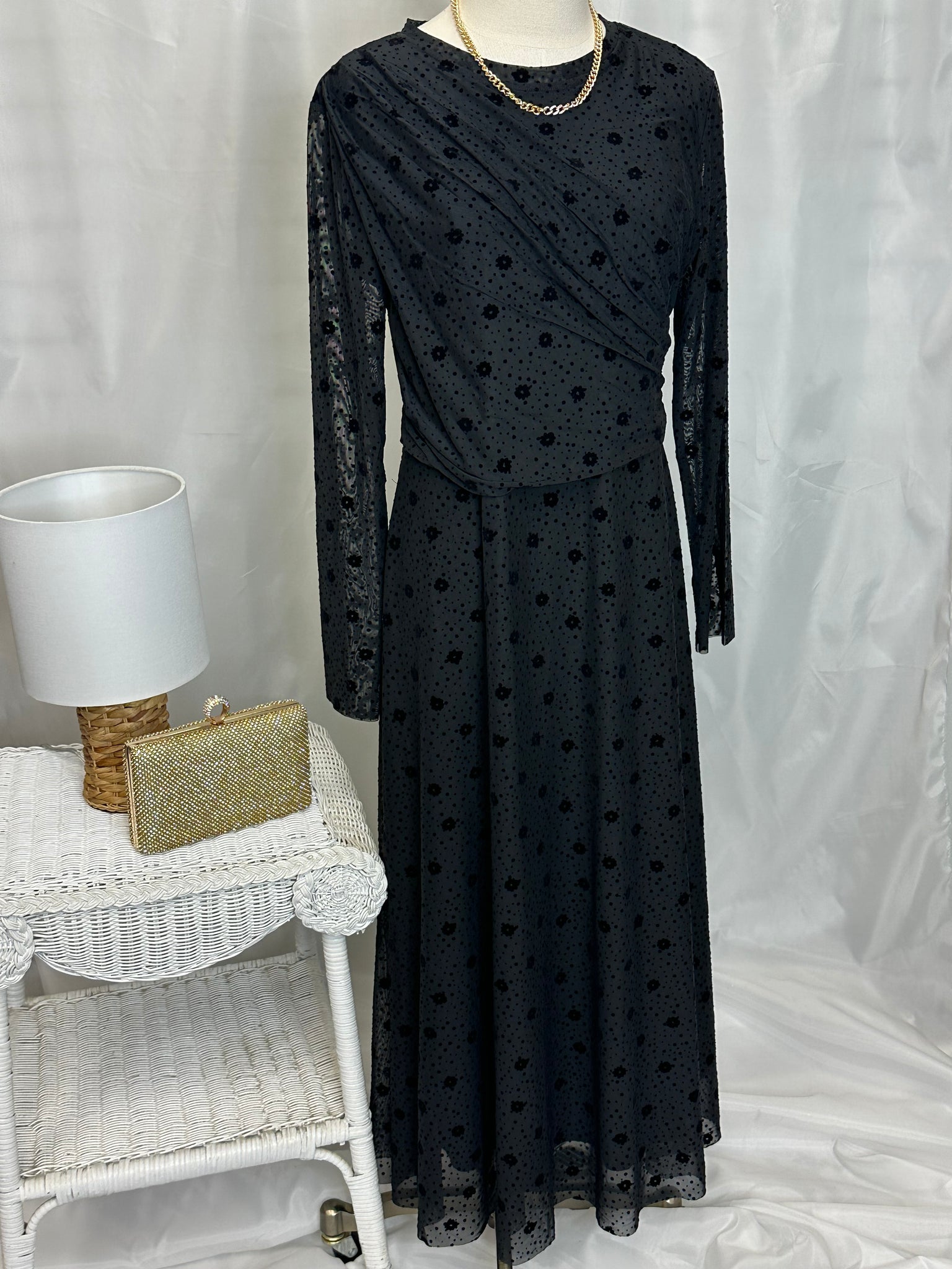 The Drapery Dress is a stunning maxi dress featuring a round neckline and sheer long sleeves. Its unique draped design flatters the midsection and creates a flowy silhouette. With a fully lined interior, this dress offers both comfort and style. Elevate your outfit with this versatile and elegant piece.