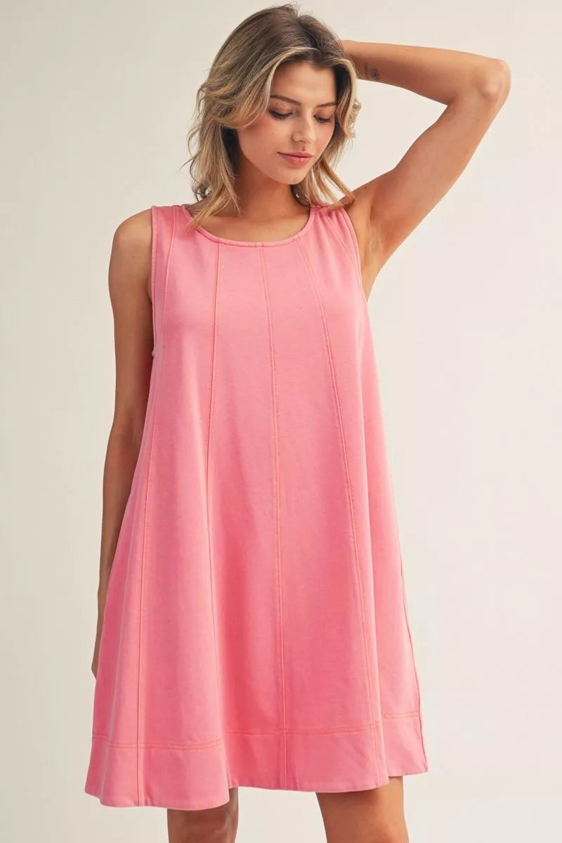 Sleeveless washed fabric casual swing dress with side pockets.