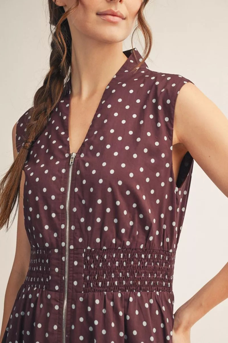 Effortless elegance meets playful style with this sleeveless midi dress. The front zip-up design offers easy on-and-off convenience, while delicate waist smocking creates a flattering, defined silhouette. Classic polka dots add a timeless charm perfect for casual outings or dressed-up occasions. Lightweight and versatile, this piece transitions seamlessly from day to night.