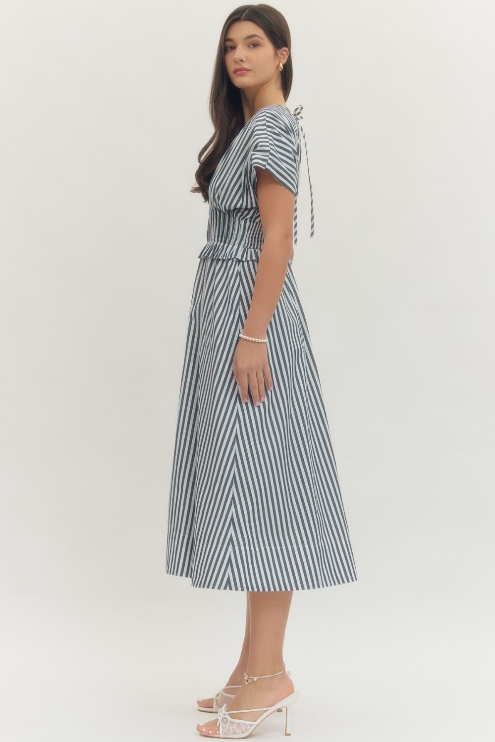 Stripe short flutter sleeve midi dress featuring front zipper closure. Back tie keyhole. Side pockets. Lined. Woven. Non-sheer. Lightweight.