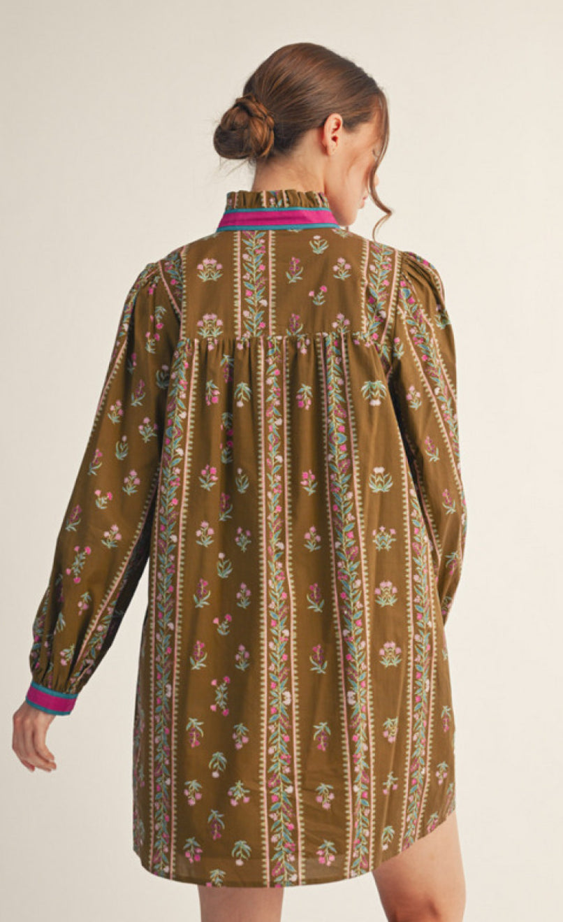 Introducing the On Board Dress - a must-have for any fashion-forward wardrobe. This elegant dress features long sleeves, a lovely floral pattern, and convenient side pockets. The ruffled standing neckline adds a touch of femininity, while the solid contrast detail elevates the overall look. Perfect for any occasion, this dress combines style and functionality for a truly versatile piece.