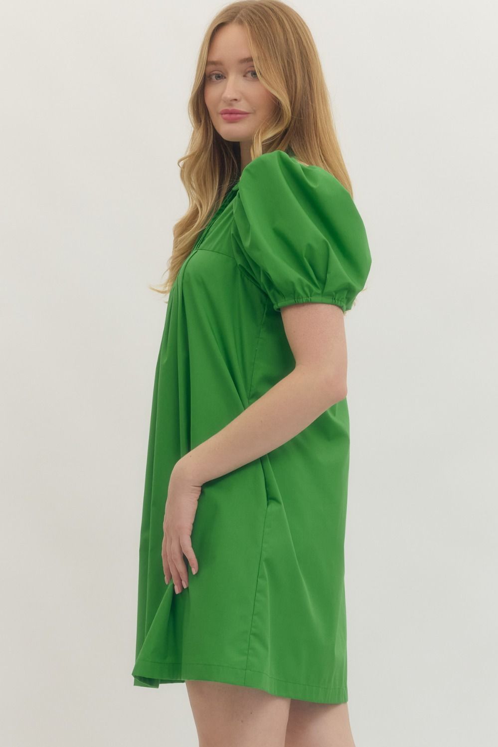 Solid short puff sleeve mini dress featuring pintuck front panel and button closure at front. Elasticated sleeve openings. Side pockets. Lined. Woven. Non-sheer. Lightweight.
