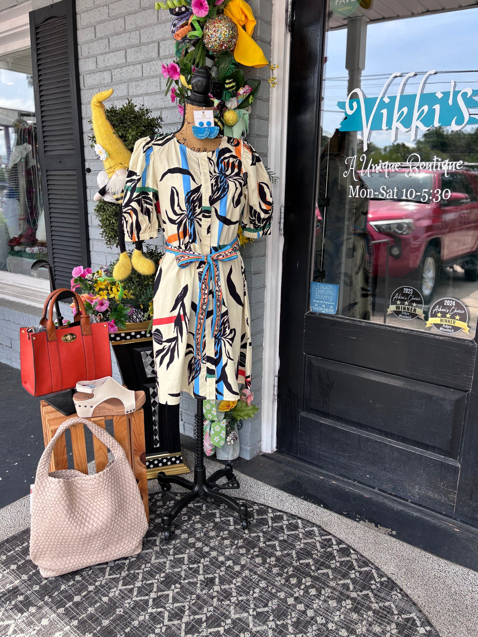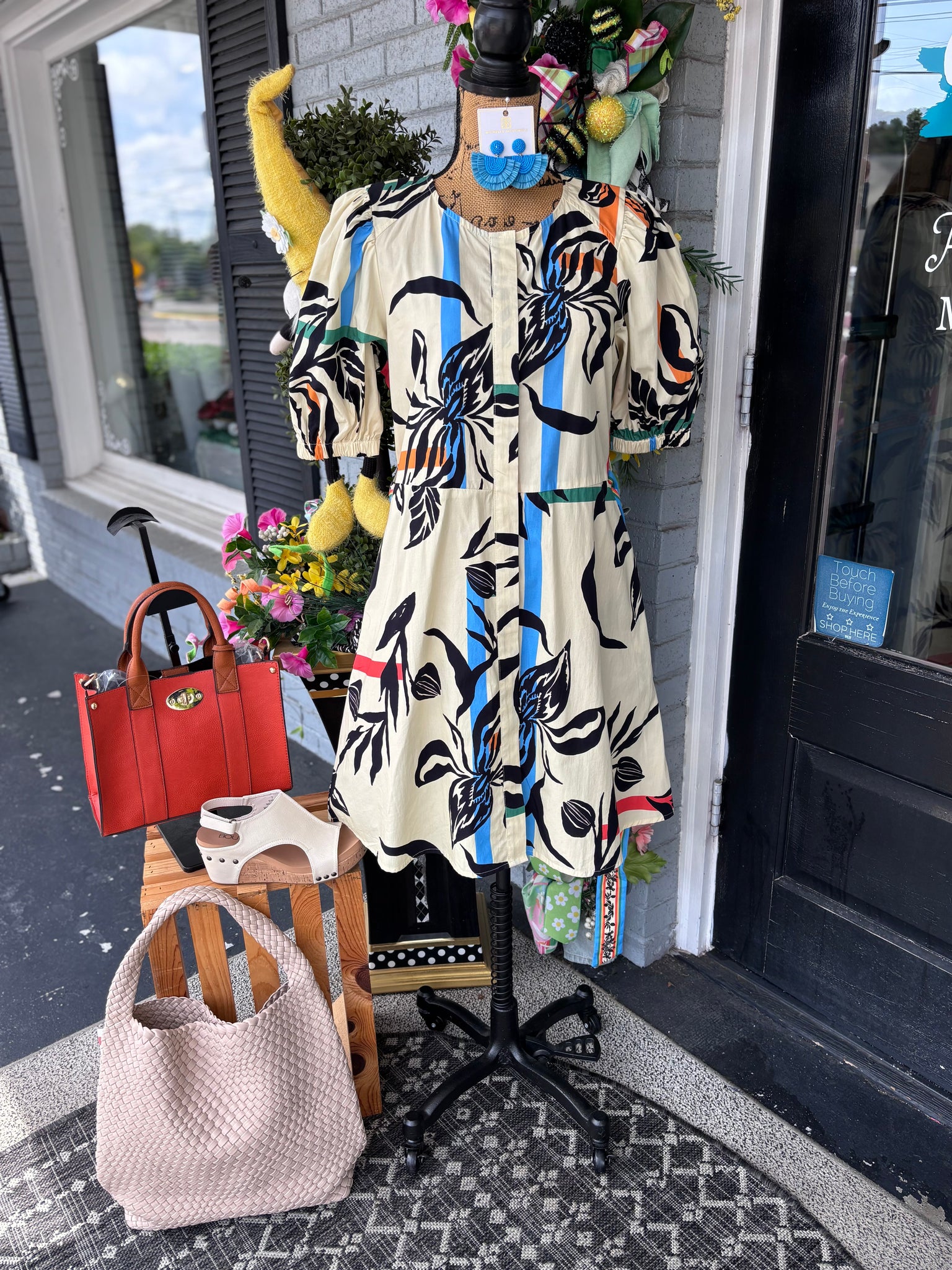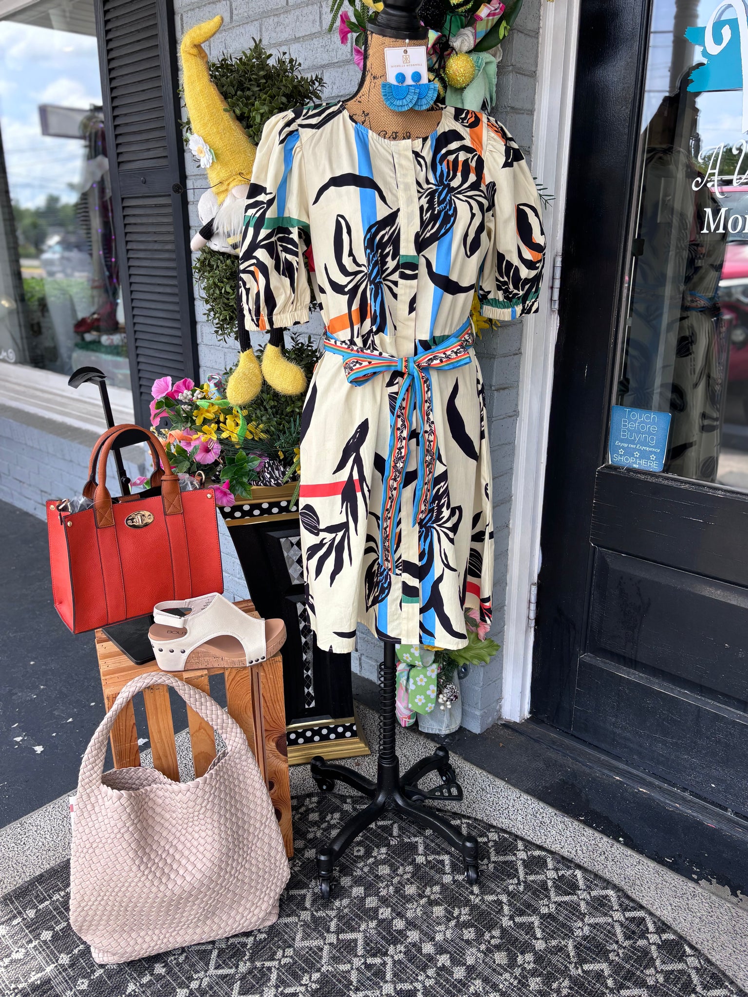 As a product expert, I can confidently state that the Skyla Dress is a versatile and comfortable addition to any wardrobe. Made with lightweight 100% cotton and featuring a knee-length cut, puff sleeves, hidden front buttons, and hip pockets, this dress offers both style and functionality. The matching belt adds a touch of sophistication.
