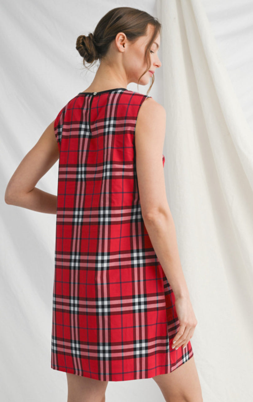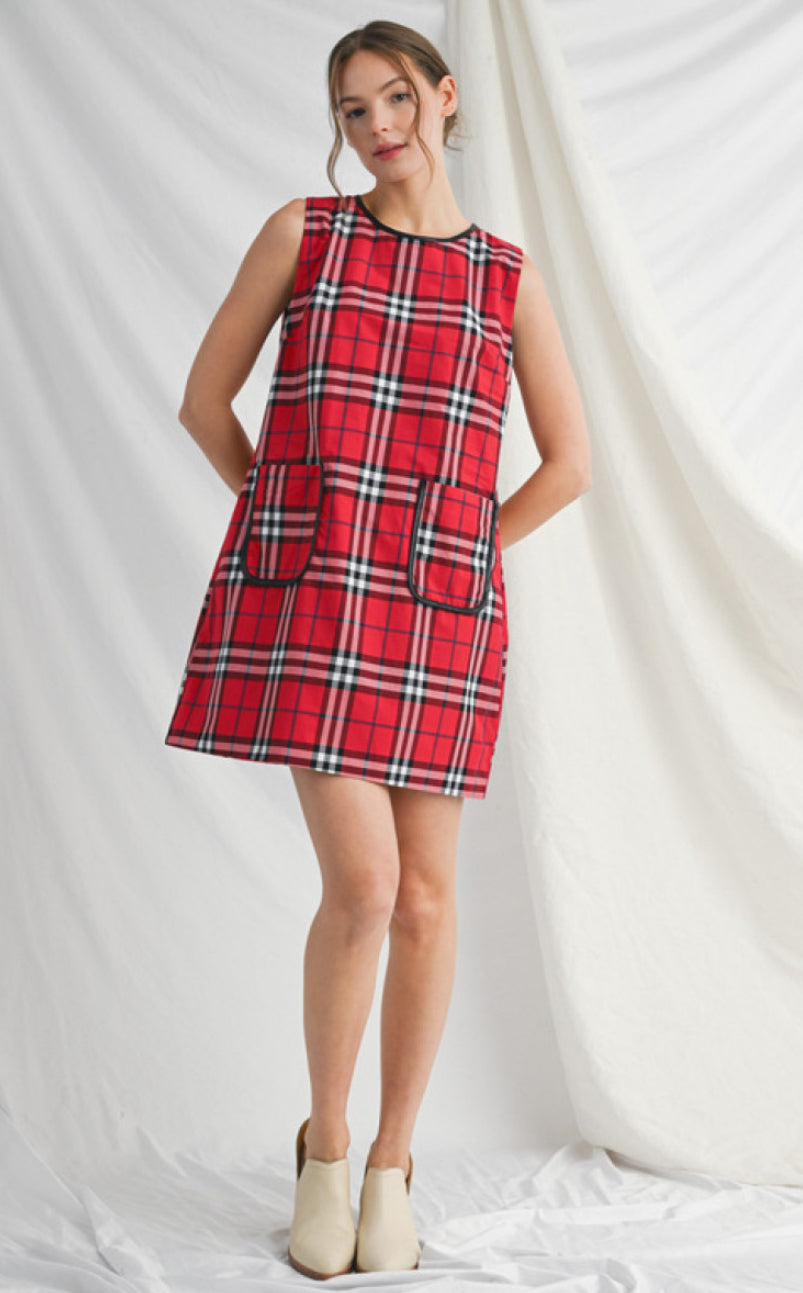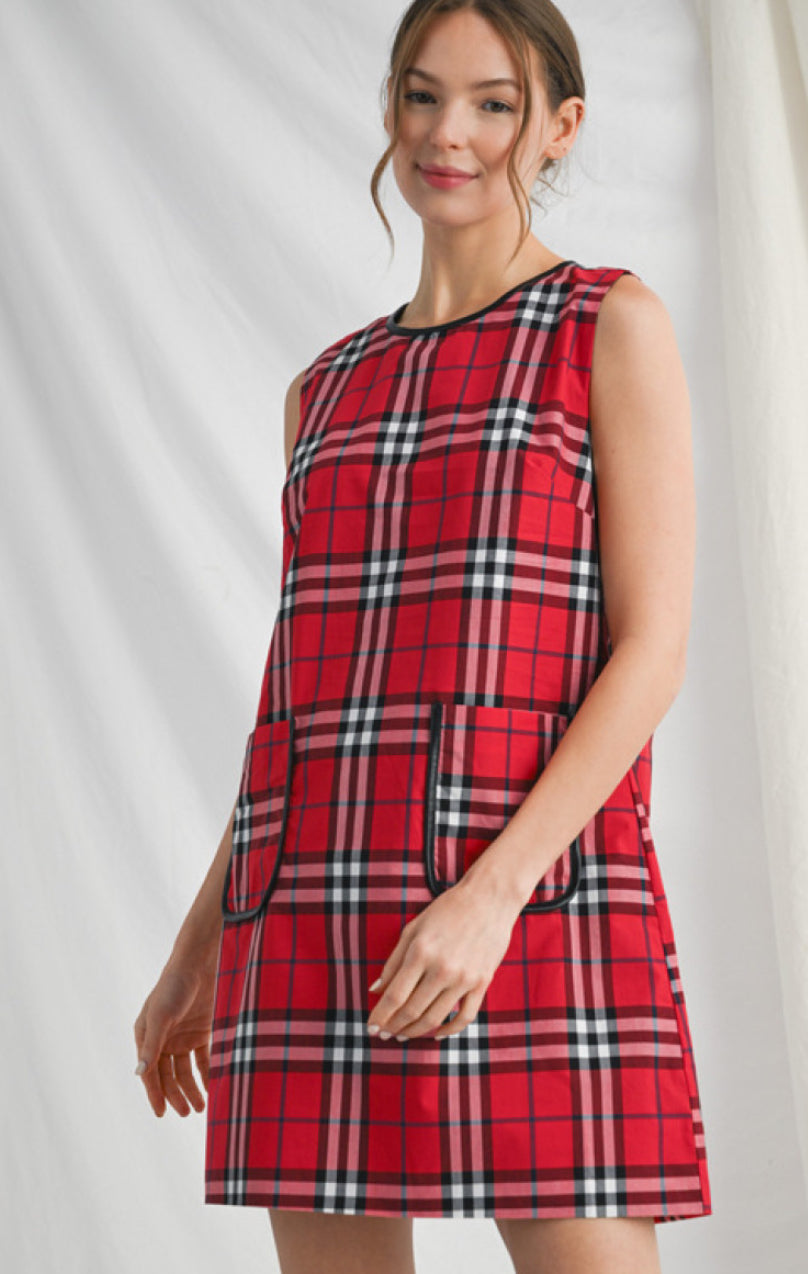 This classic checkered dress is perfect for any occasion, with its sleeveless design and convenient pocket. The sleek faux leather edge trim adds a touch of sophistication, while the button closure back ensures a comfortable fit. Expertly crafted for style and function.