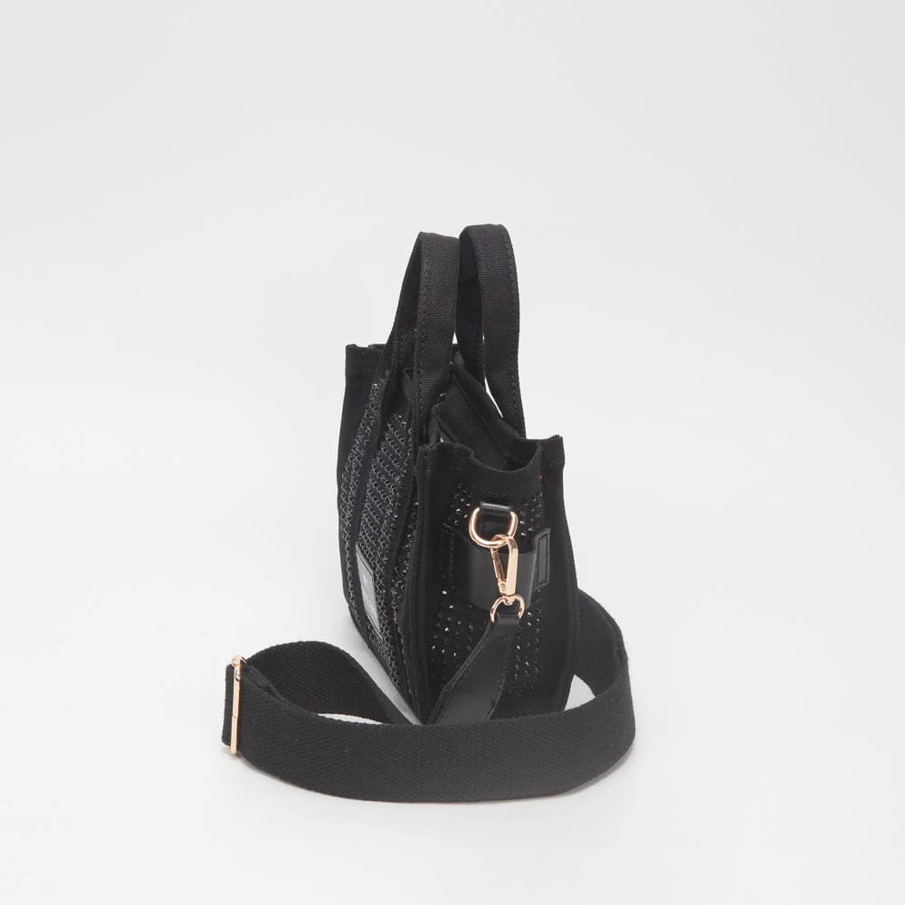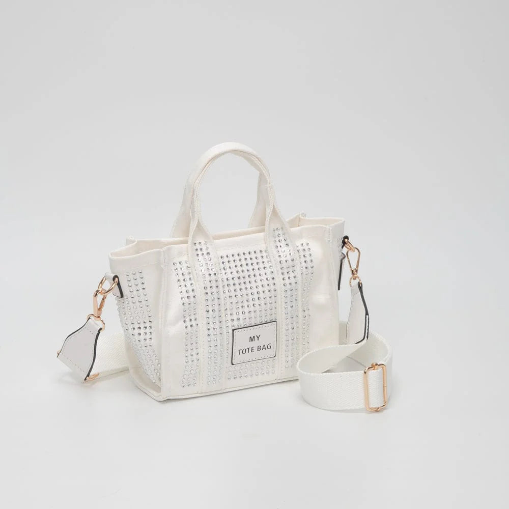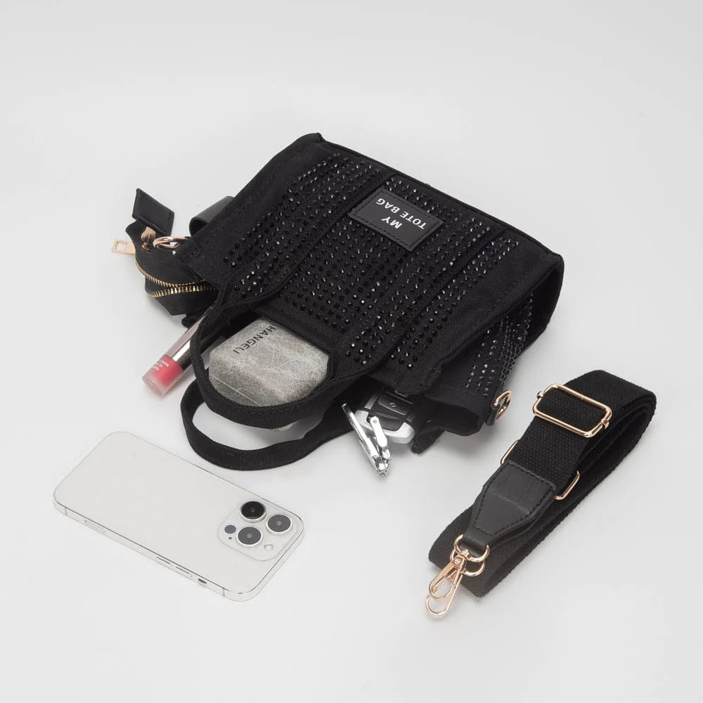 Sparkle on the go with this adorable rhinestone canvas mini tote! Perfect for carrying your essentials with a touch of glam, this versatile bag transitions seamlessly from shoulder tote to crossbody style. The shimmering rhinestone embellishments catch the light beautifully, making it an instant conversation starter. Lightweight canvas construction keeps things practical while the compact size fits snugly into your lifestyle. Whether you're heading to brunch, running errands, or hitting the town, this pint-sized stunner delivers big personality in a small package.