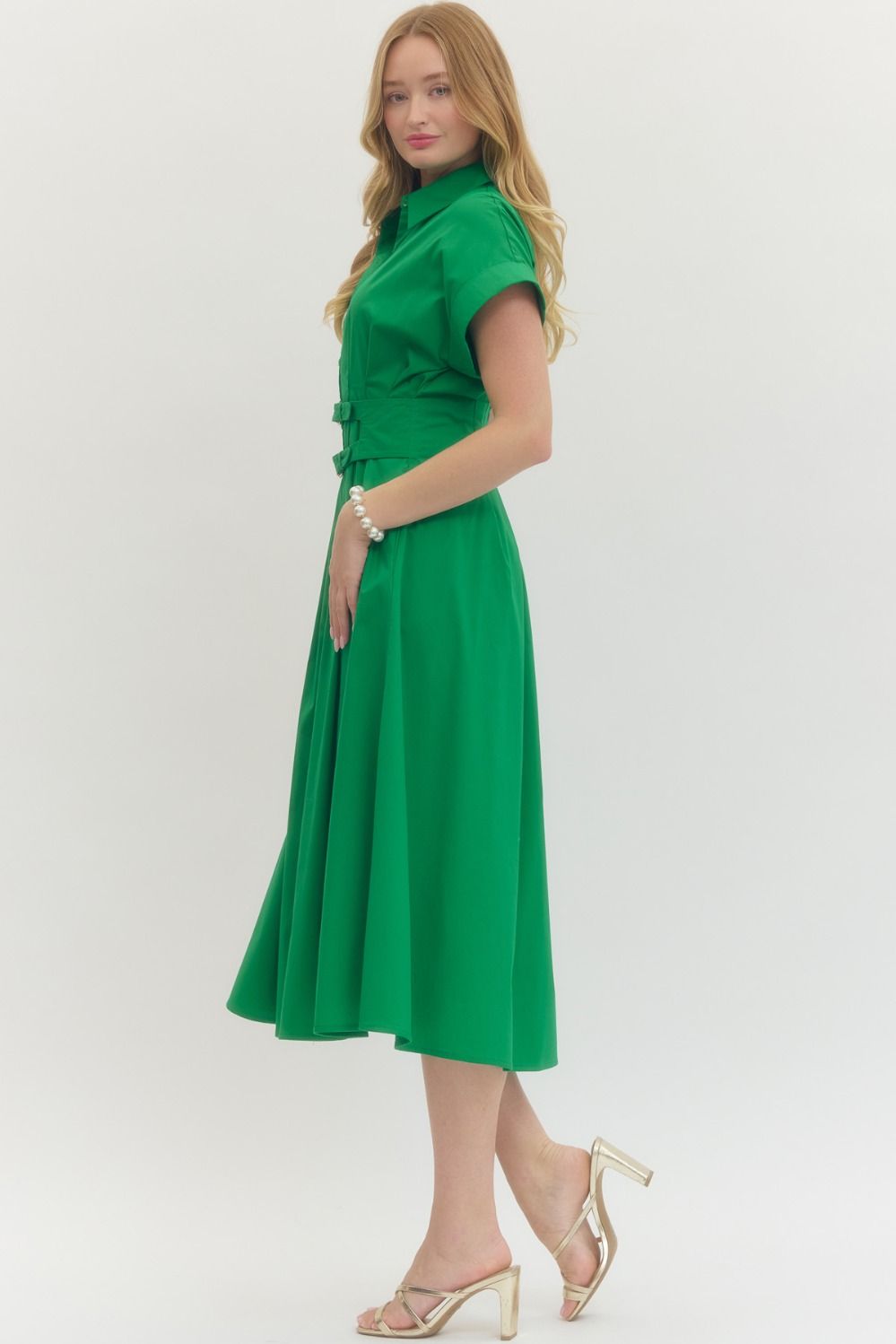 Solid collared short sleeve midi dress featuring pleated detail at waist and double belt with buckle. Button closure at front. Side pockets. Lined. Woven. Non-sheer. Lightweight.