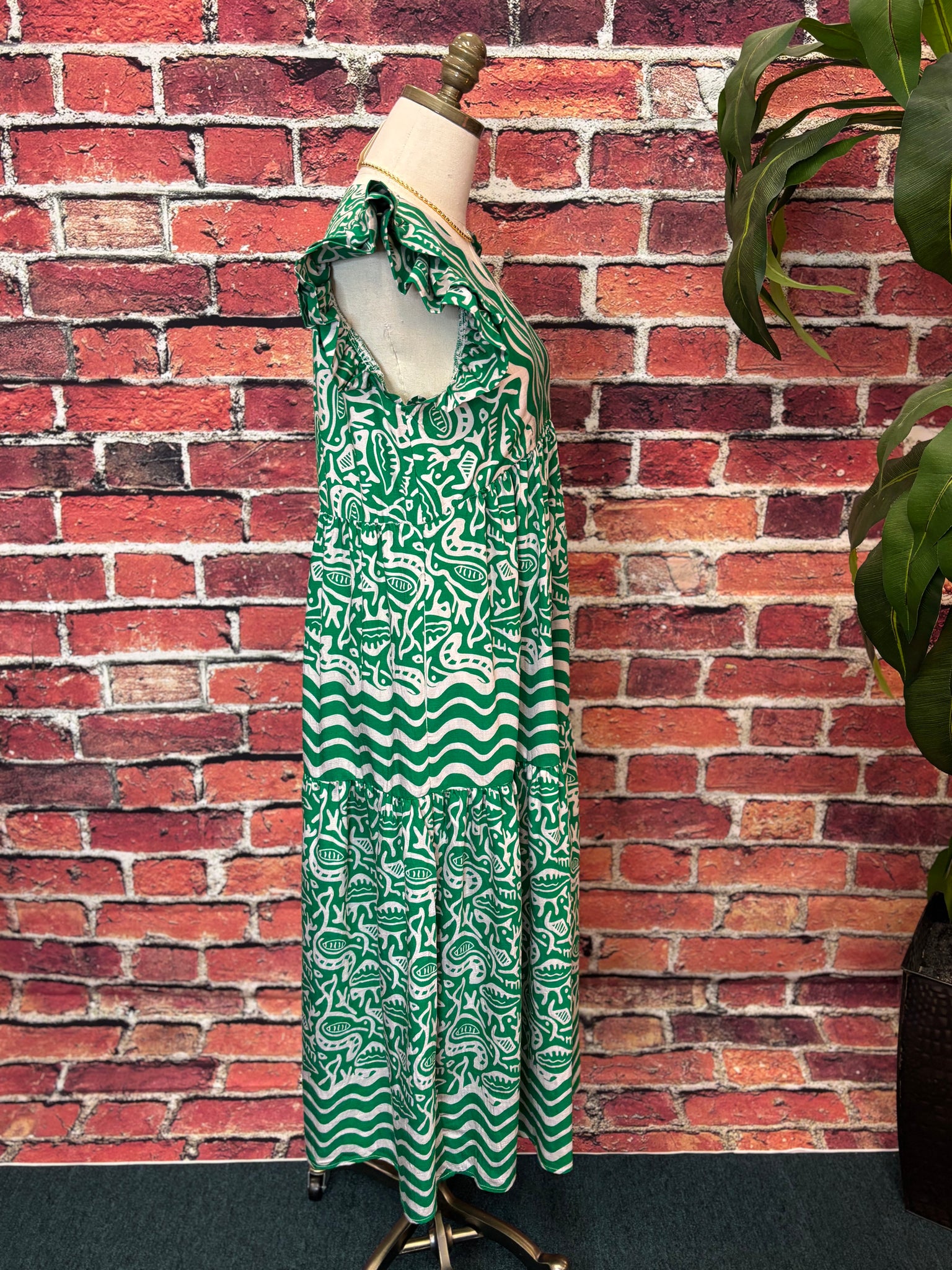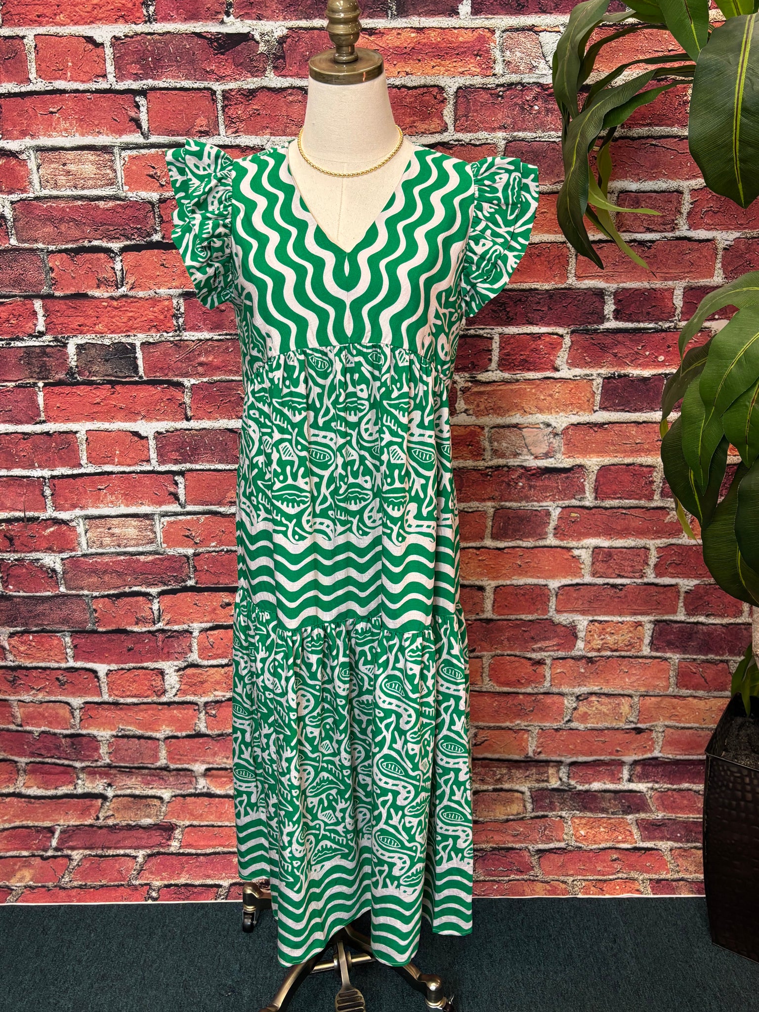 Fresh, fun, and full of personality 💚 This emerald green midi dress features a playful mix of wave and abstract prints that make it an instant standout. The contrasting patterns give it that eye-catching boutique feel while still being effortlessly wearable.