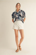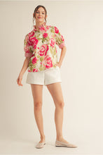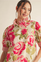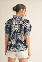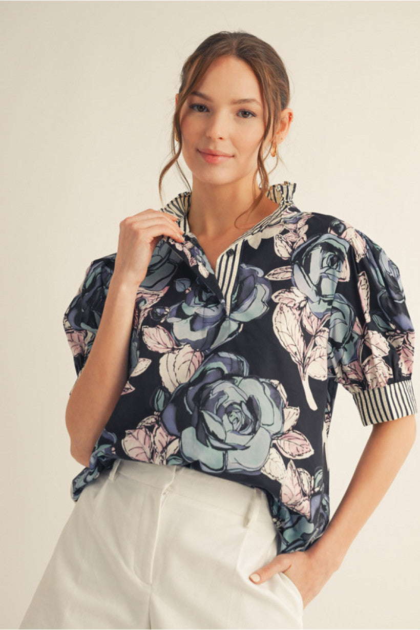 Short sleeves ruffled mock neck floral top, front button, stripe contrast accent.