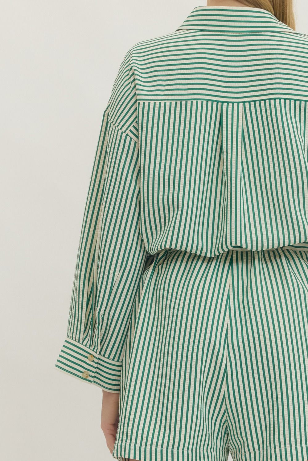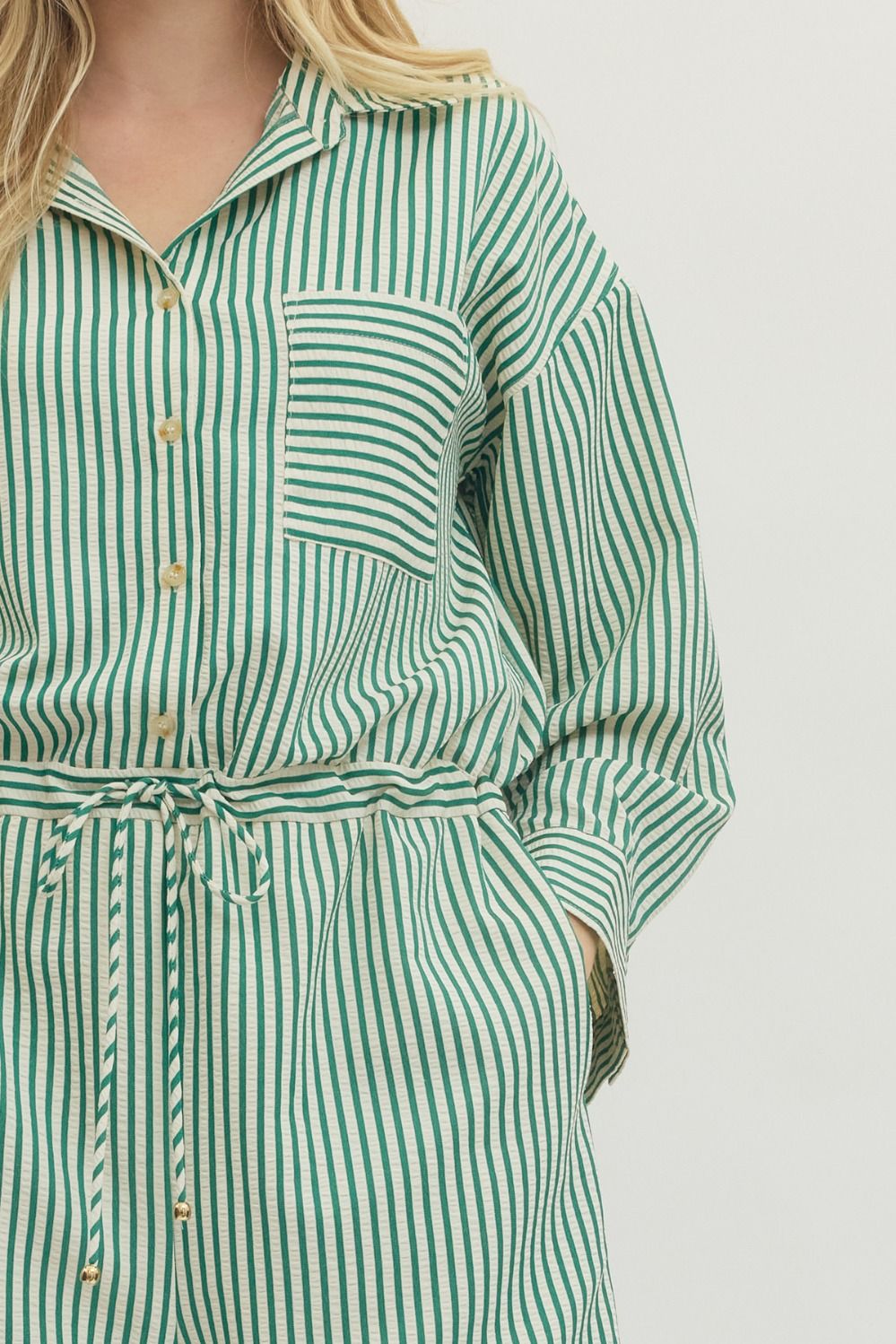 Striped long sleeve shorts romper featuring adjustable drawstring waist. Button closure at front. Side pockets. Lined. Woven. Non-sheer. Lightweight. 100% Poly