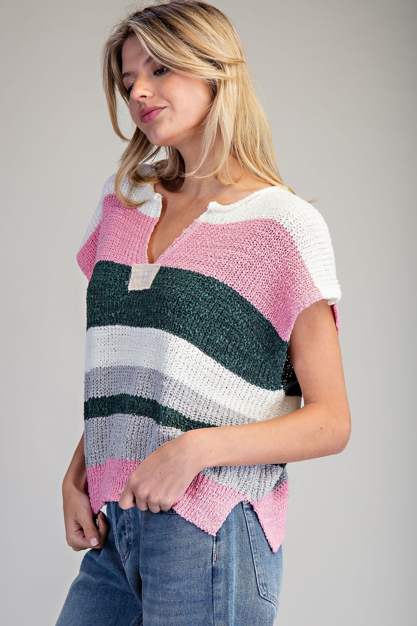 Introducing our Tall Take Top - a cozy and stylish addition to your wardrobe. Made with a chunky, textured knit and multicolor stripes, this sleeveless top exudes a vintage-inspired vibe. The split neckline, cap sleeves, and side slits add comfort and versatility, making it a must-have for any fashion-forward individual.