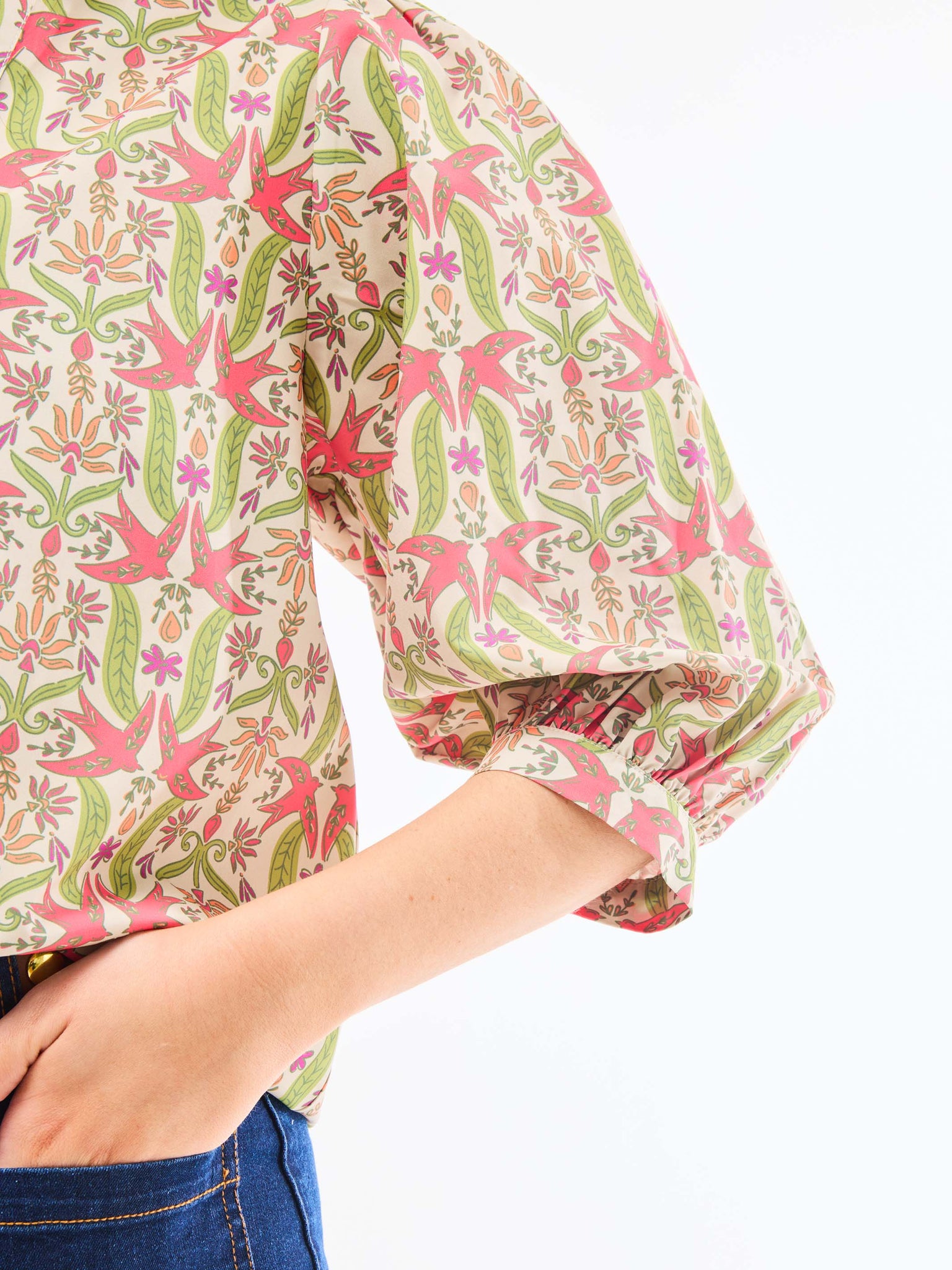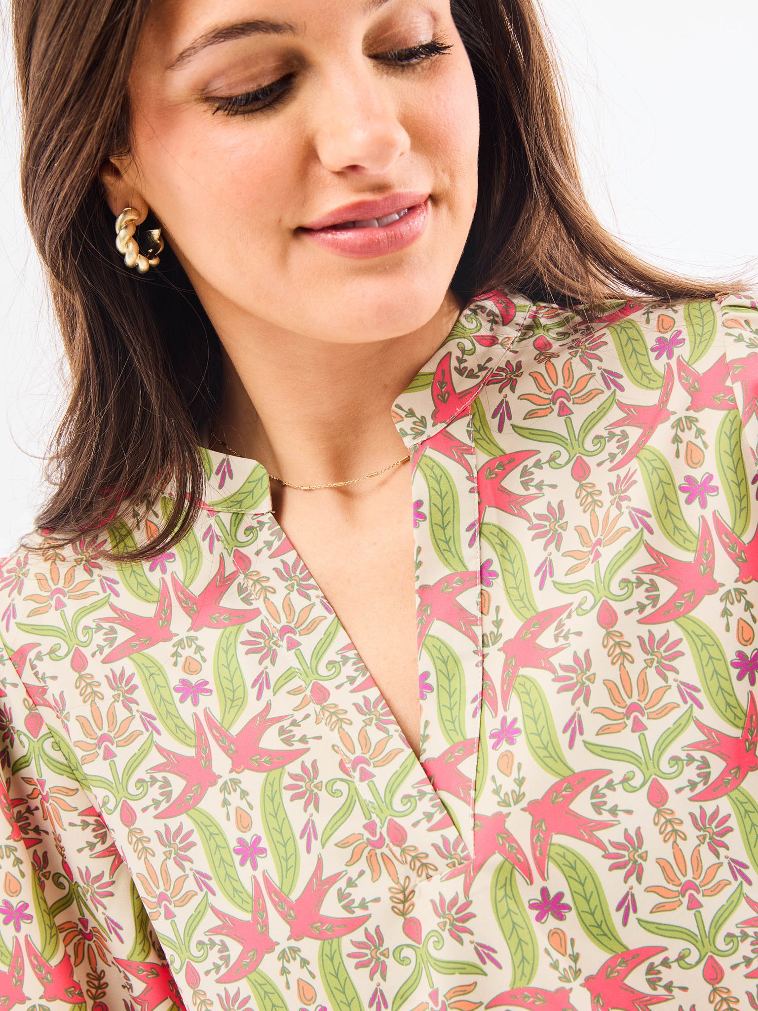 2/3 sleeve with banded cuff opening, hits at hip, lightweight, non sheer, v-neckline,