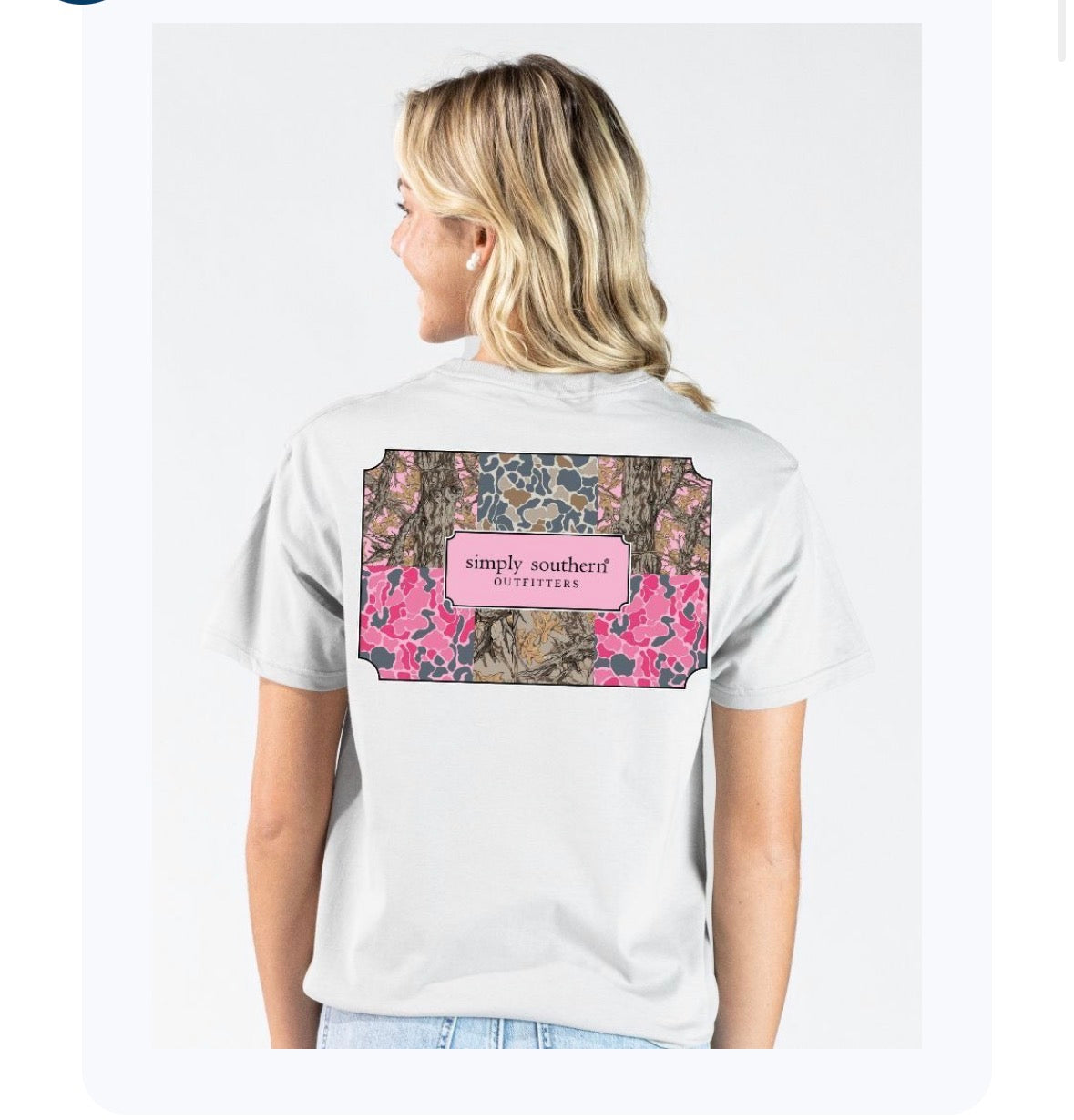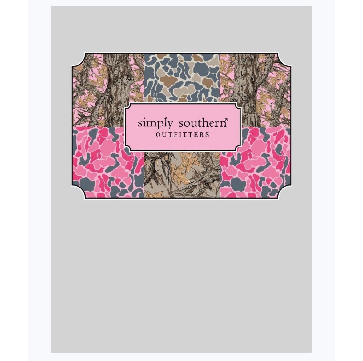 Made from 100% soft, breathable cotton, this short sleeve basic tee delivers all-day comfort in a clean, classic cut. This star grey tee features the Simply Southern logo with a border of paneled camo patterns.