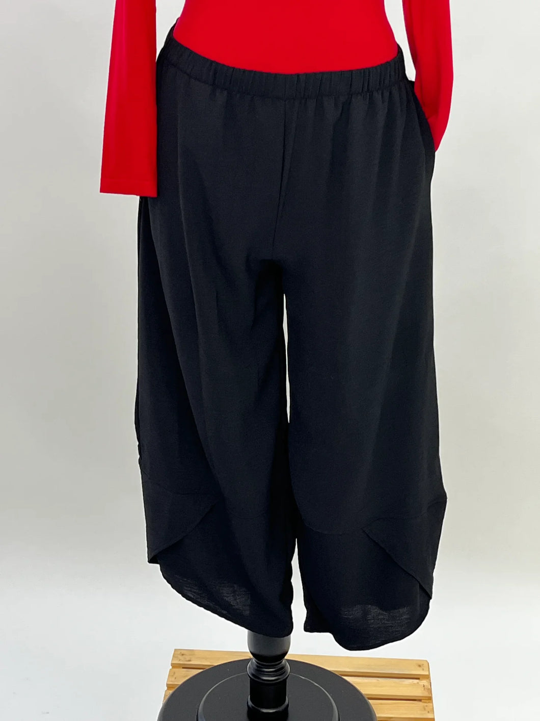 This adorable air flow harem pant has a super cute tulip bottom on them. They have a slight split in the bottom for more movement and of course they have pockets!! They have an elastic waist pant and will fit ankle length.