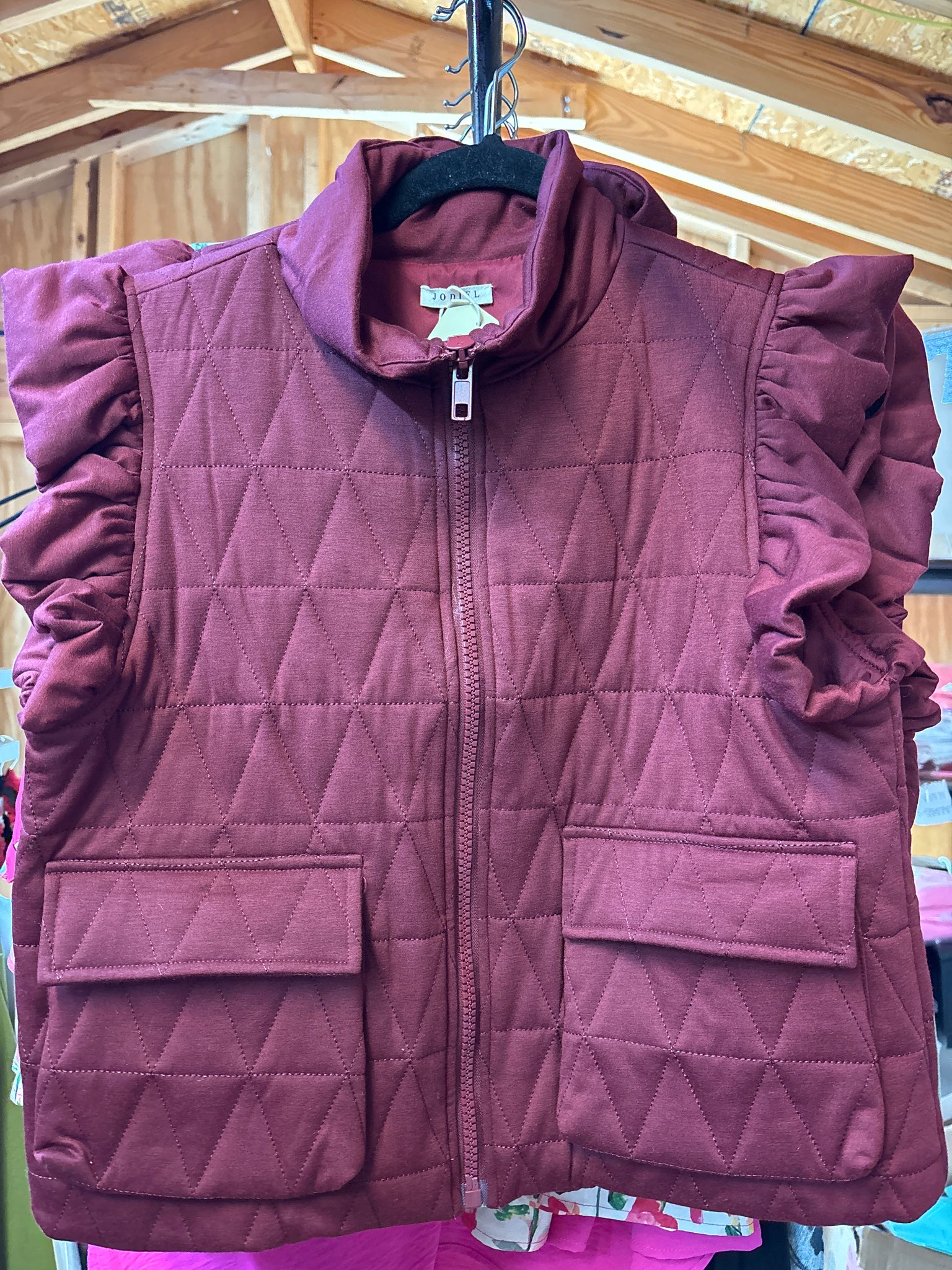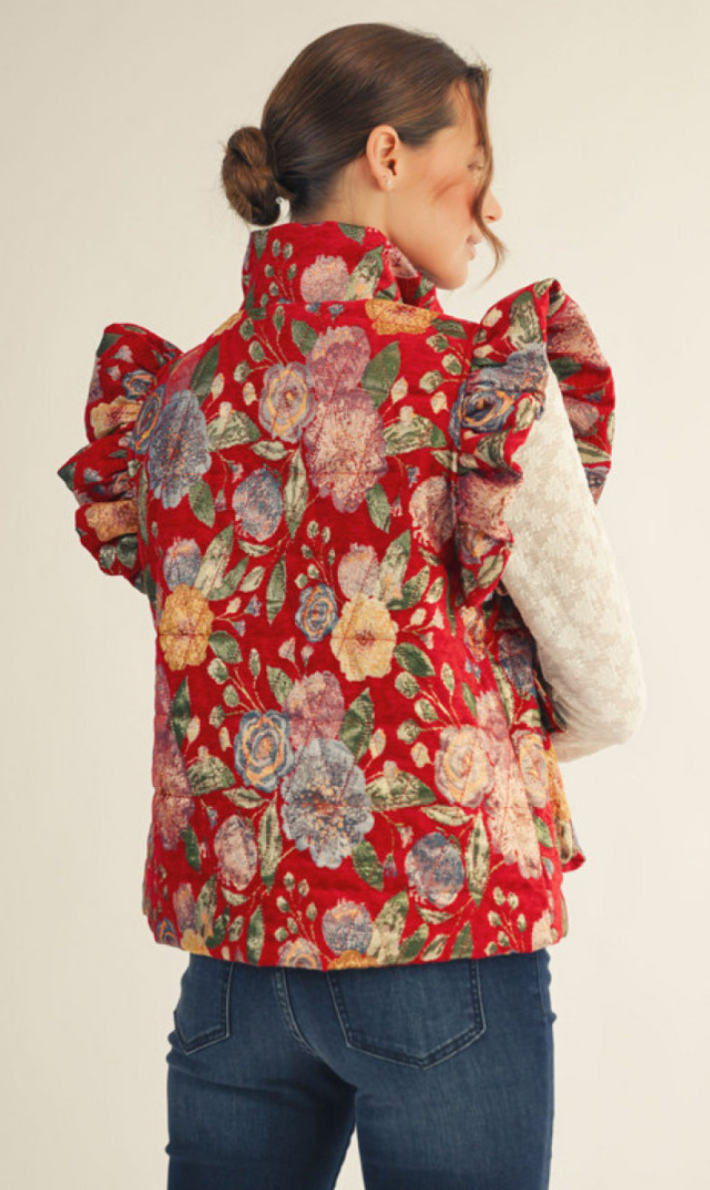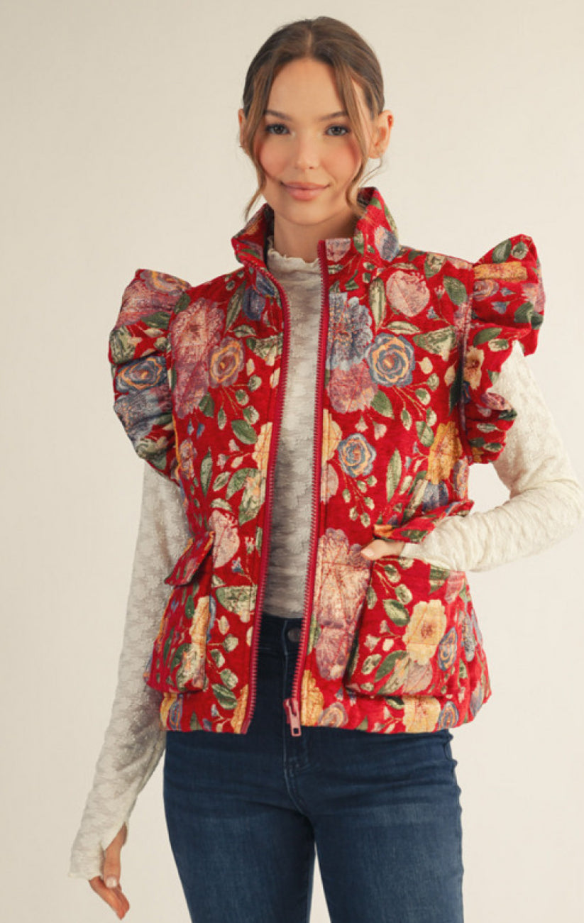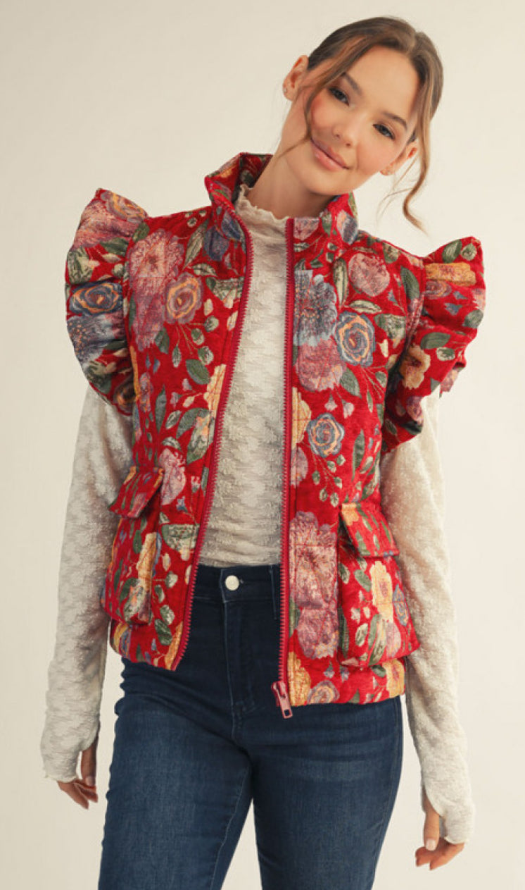 This vest highlights ruffled cap sleeves and a floral jacquard design, providing a stylish addition to any outfit. Its zip-up feature and pockets offer convenience and functionality. Stay fashion-forward with the What You Doin Vest.