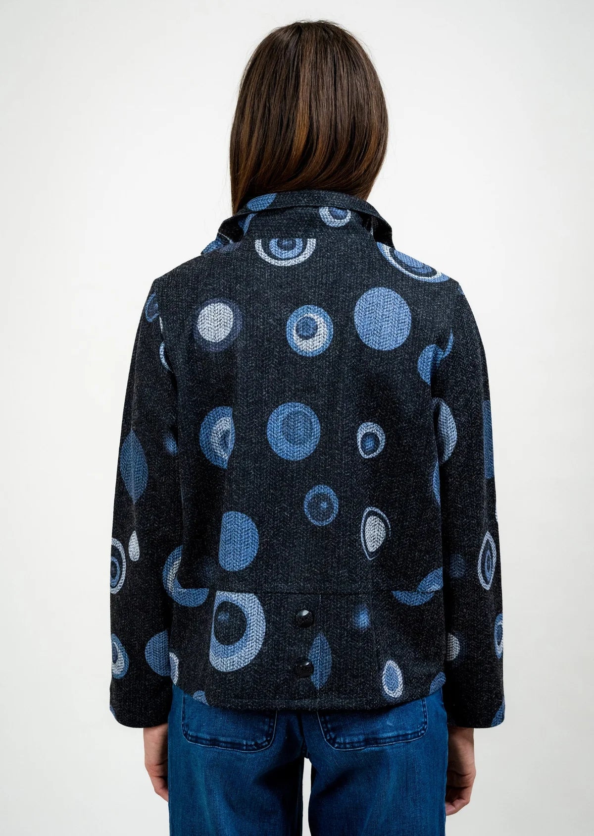This playful yet sophisticated jacket brings a modern edge to your wardrobe with its bold circular motif in denim blue tones against a deep black background. Designed with a sculpted wire collar that can be styled up or down, it features button detailing along the front and at the back for added interest. The relaxed silhouette and functional pockets make it as practical as it is stylish, perfect for layering over both casual and polished looks.
