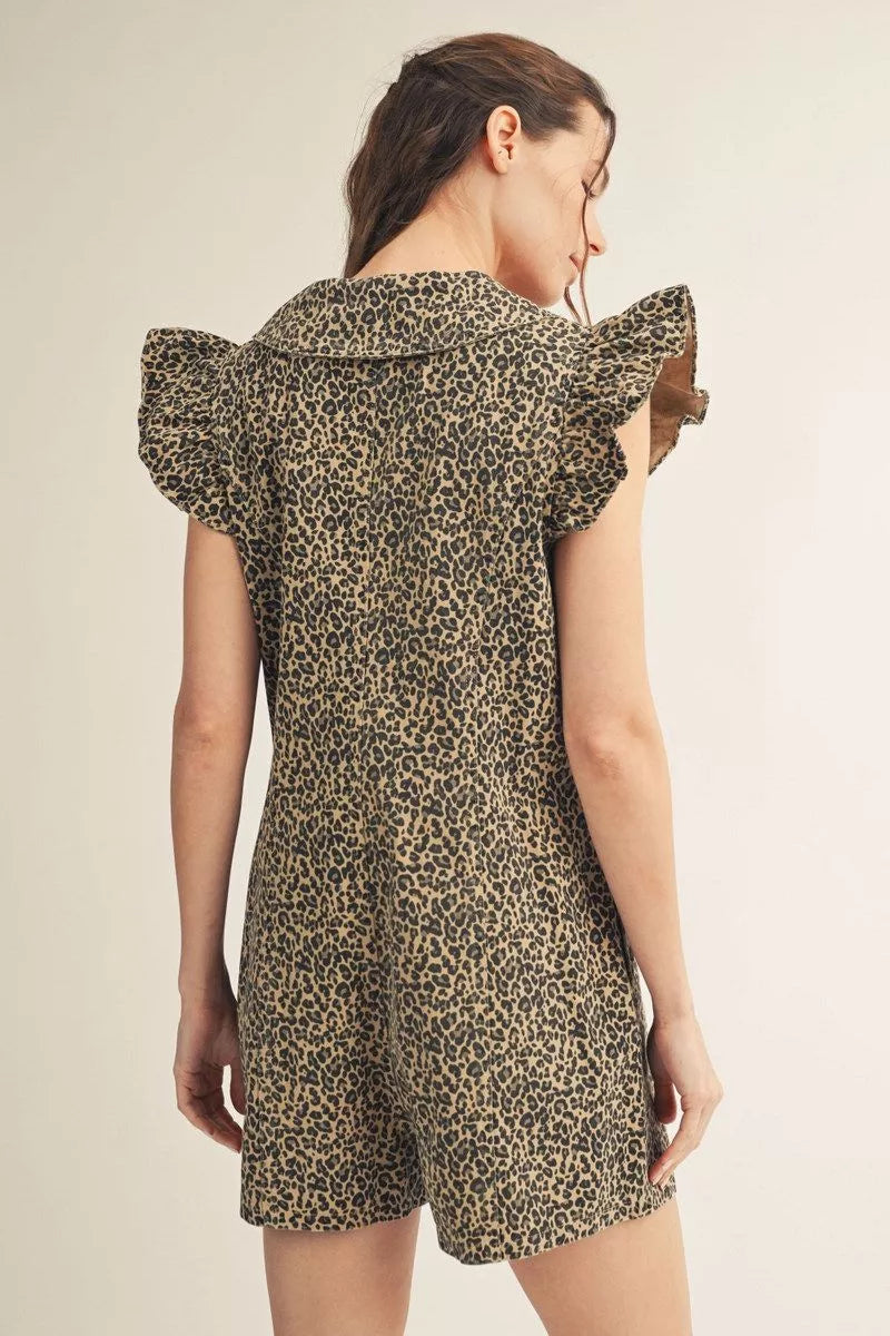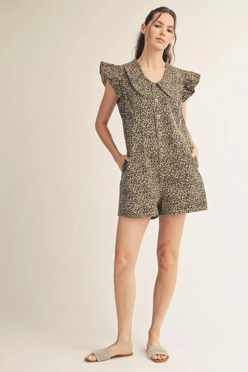 Ruffled cap sleeves button down leopard romper with Peter Pan collar, side pockets.