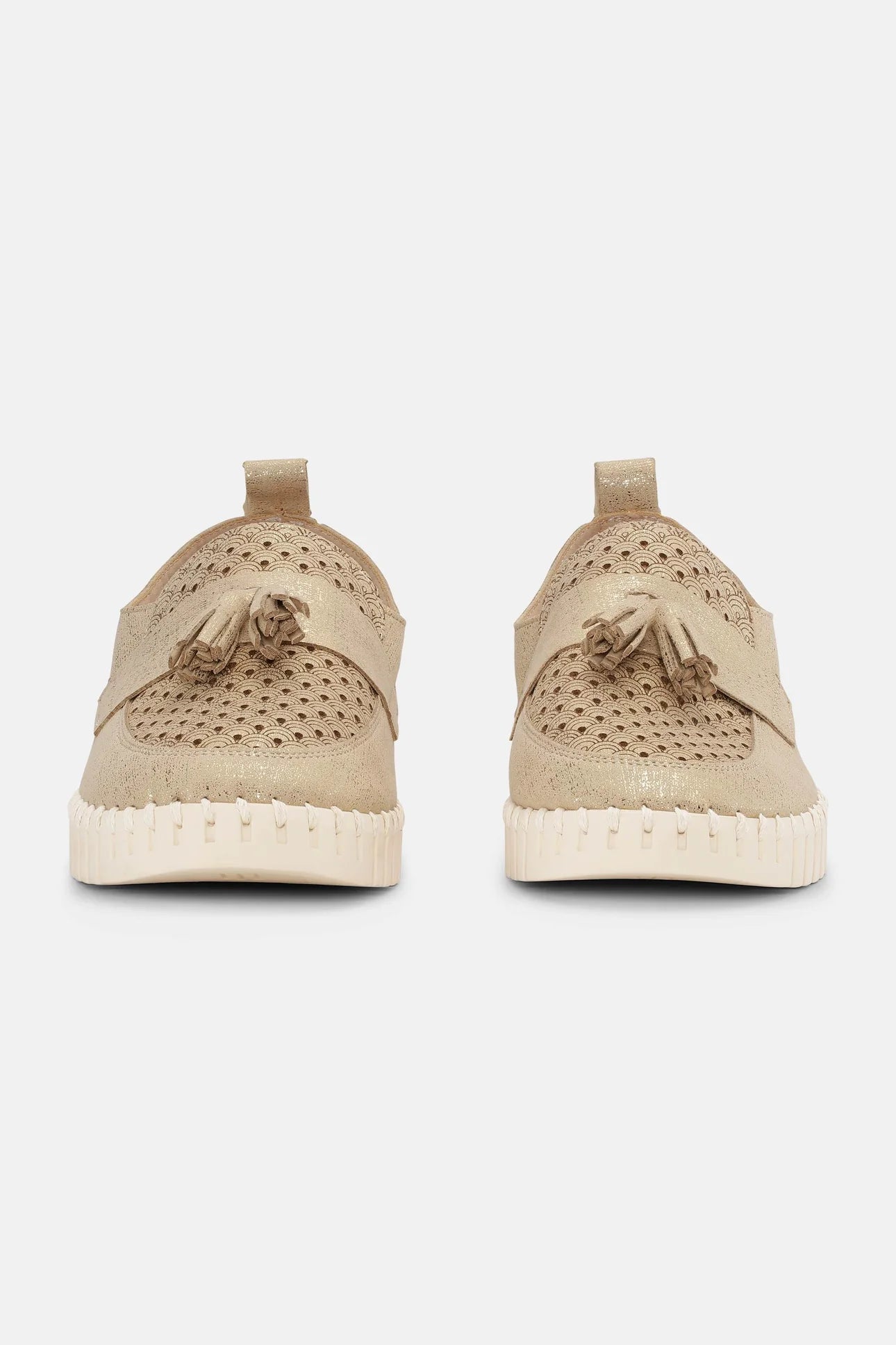 Tulip shoe in a loafer model, with a strap and tassels at the front. Featuring an upper crafted from recycled microfiber with glitter surface, and attached to our iconic Tulip outsole with matched colored recycled thread. The soft insole has padding and support, ensuring great comfort.