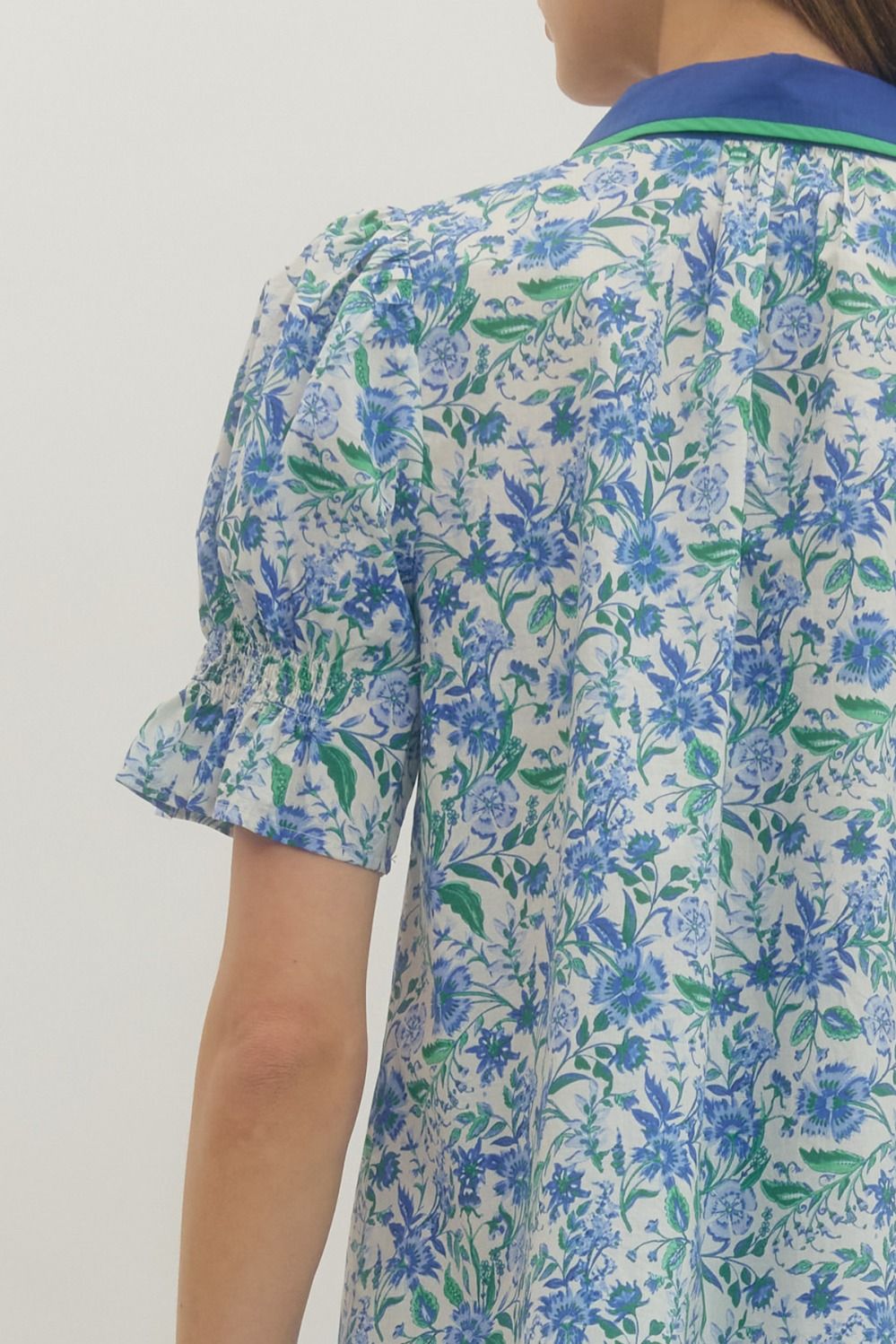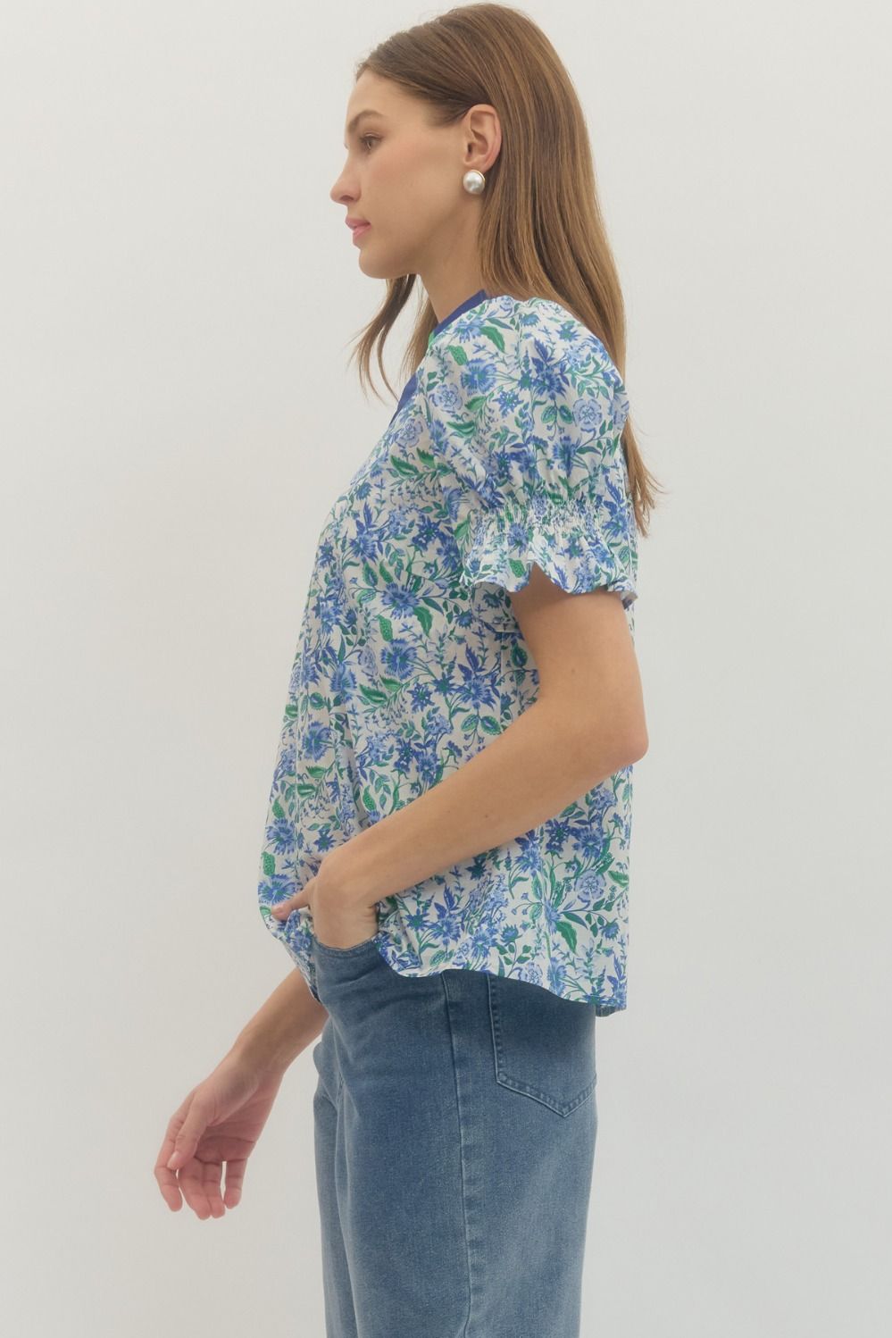 Floral print short puff sleeve waist-length top featuring contrast trim split V-neckline. Elasticated sleeve openings. Unlined. Woven. Non-sheer. Lightweight.