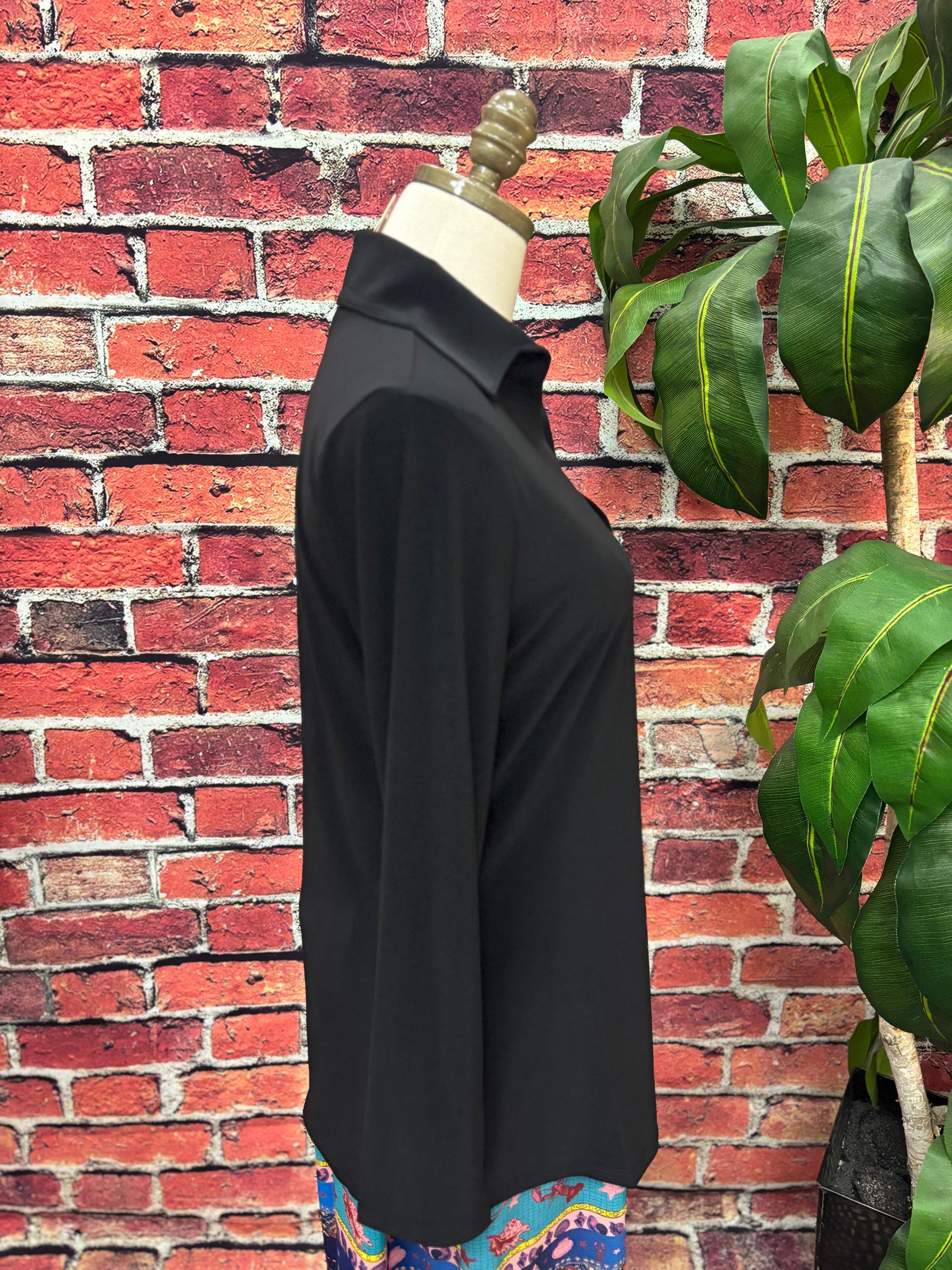 Meet your new go-to black top that does it all. The Chic After Dark Collared Tunic brings effortless polish with its sleek silhouette and flattering split V-neckline. The structured collar adds just the right touch of sophistication, while the soft stretch fabric keeps it comfortable from day to night.