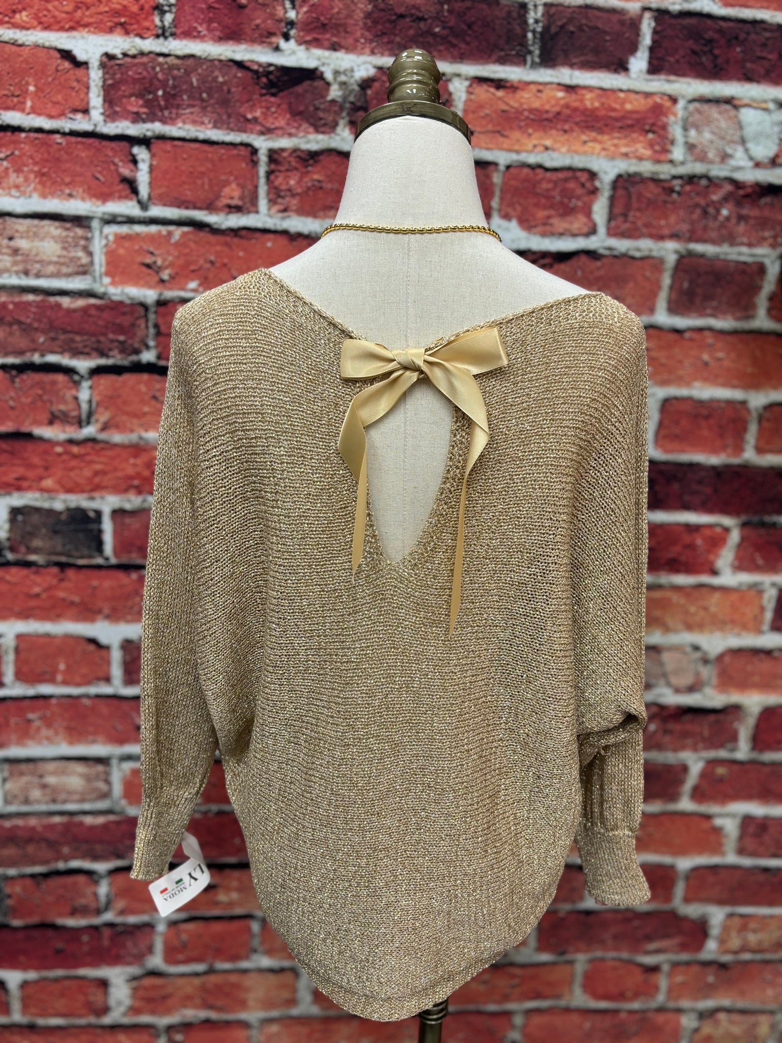 Soft, lightweight, and effortlessly chic — this subtle shimmer sweater features a relaxed silhouette with a stunning bow detail in the back for an unexpected feminine touch. The draped fit makes it easy to dress up or down.