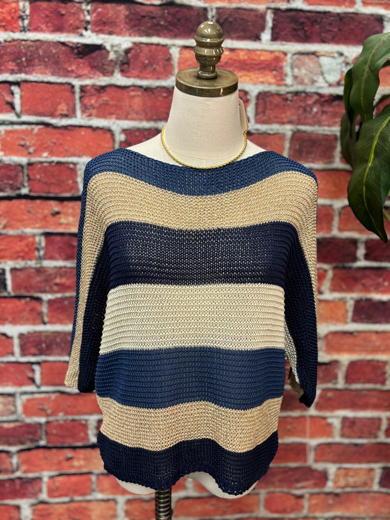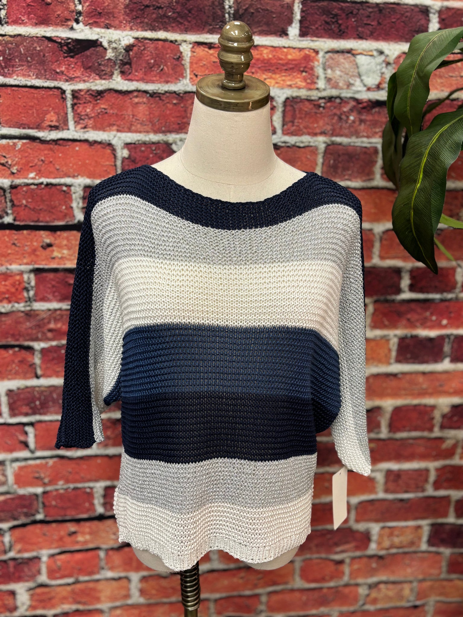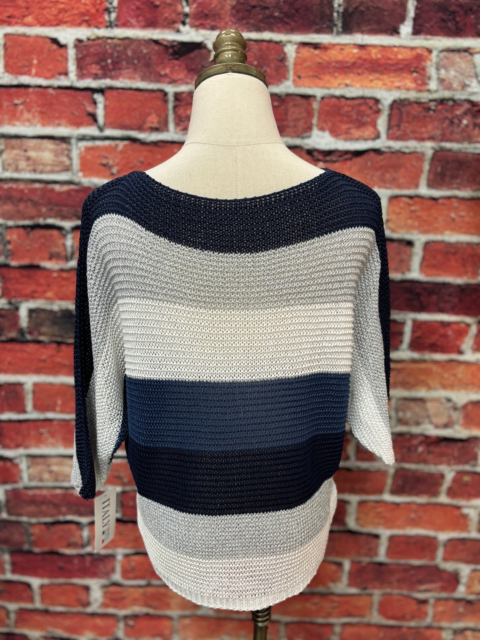 An easy, breezy knit with bold neutral or navy stripe options. Designed in a relaxed, draped silhouette with soft texture and effortless style.