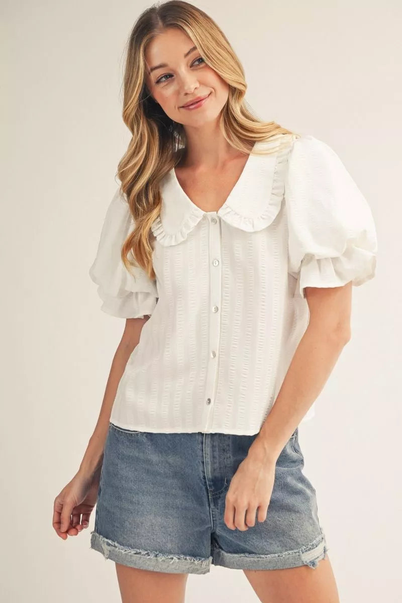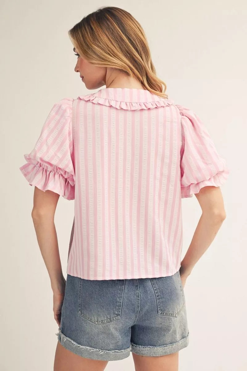 The Short Puff Sleeve Top features a button-down design with a ruffled Peter Pan collar and short puff sleeves, crafted from textured 100% polyester fabric. The stripe print adds visual interest while providing breathability and ease of movement, suitable for various occasions.