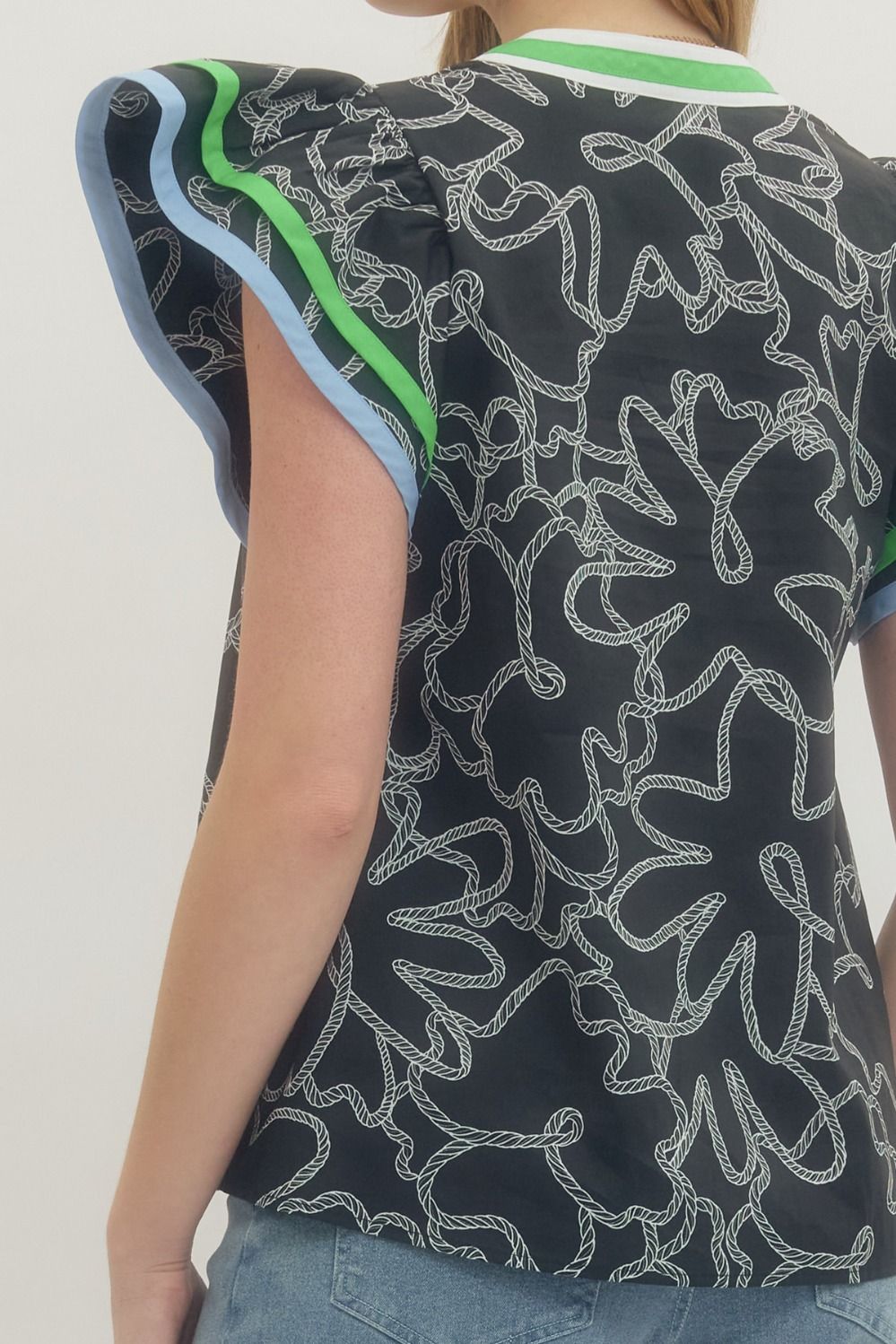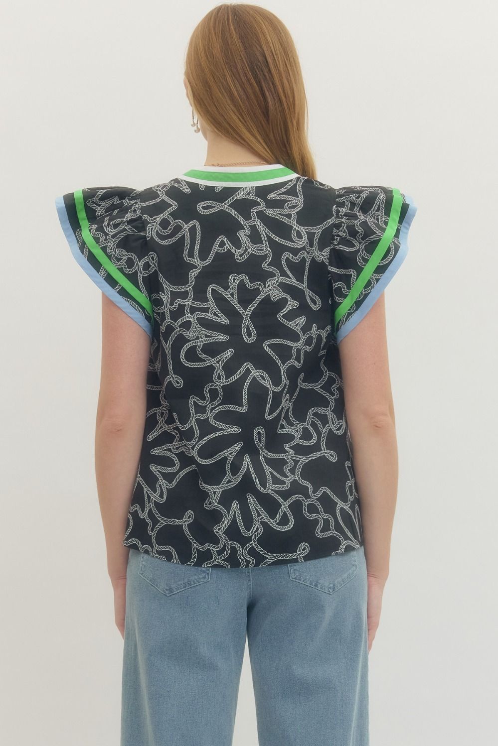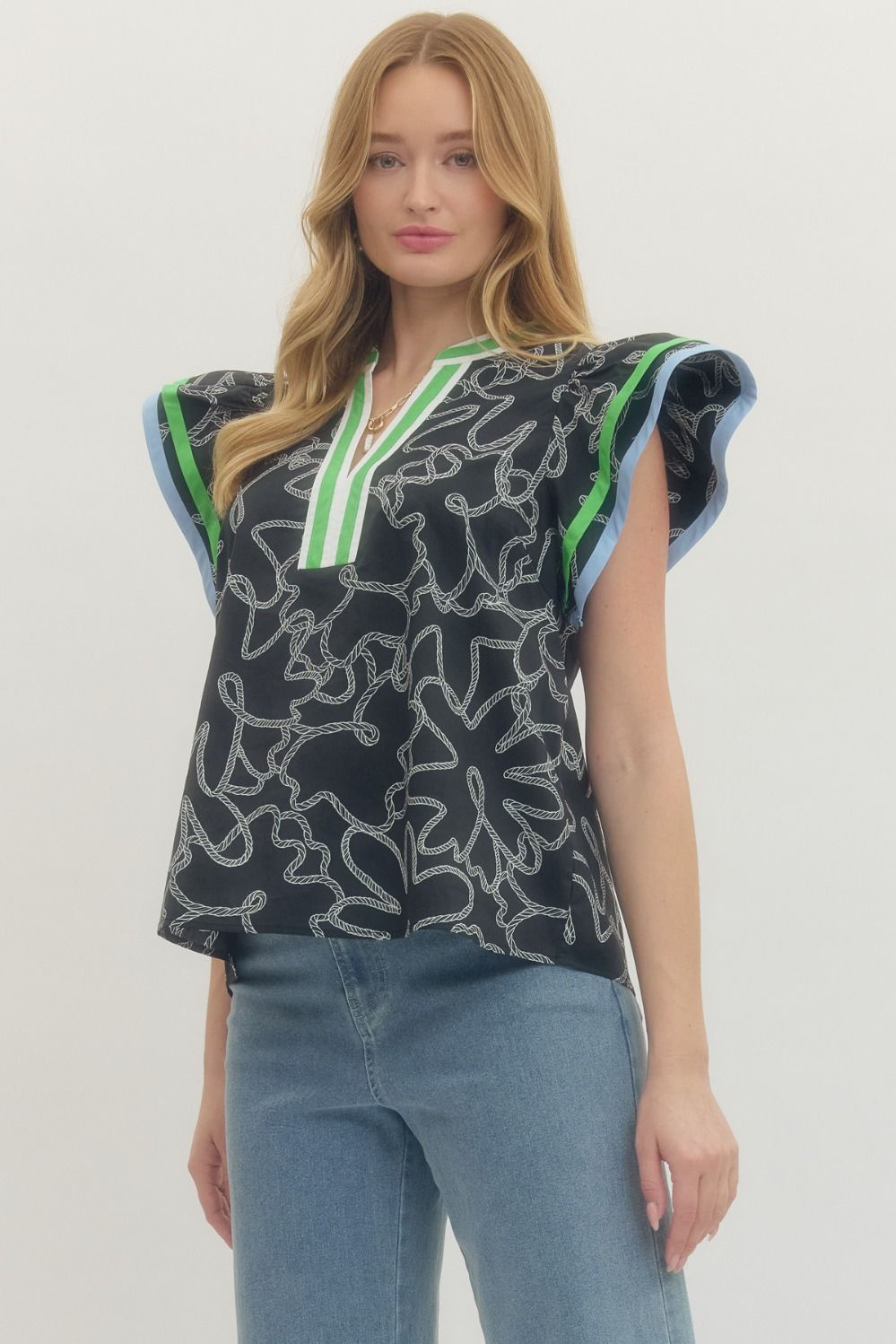 Abstract print flutter sleeve top featuring V-neck with multicolor striped trim detail. Unlined. Woven. Non-sheer. Lightweight. 100% Cotton