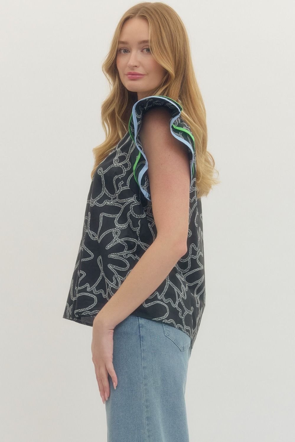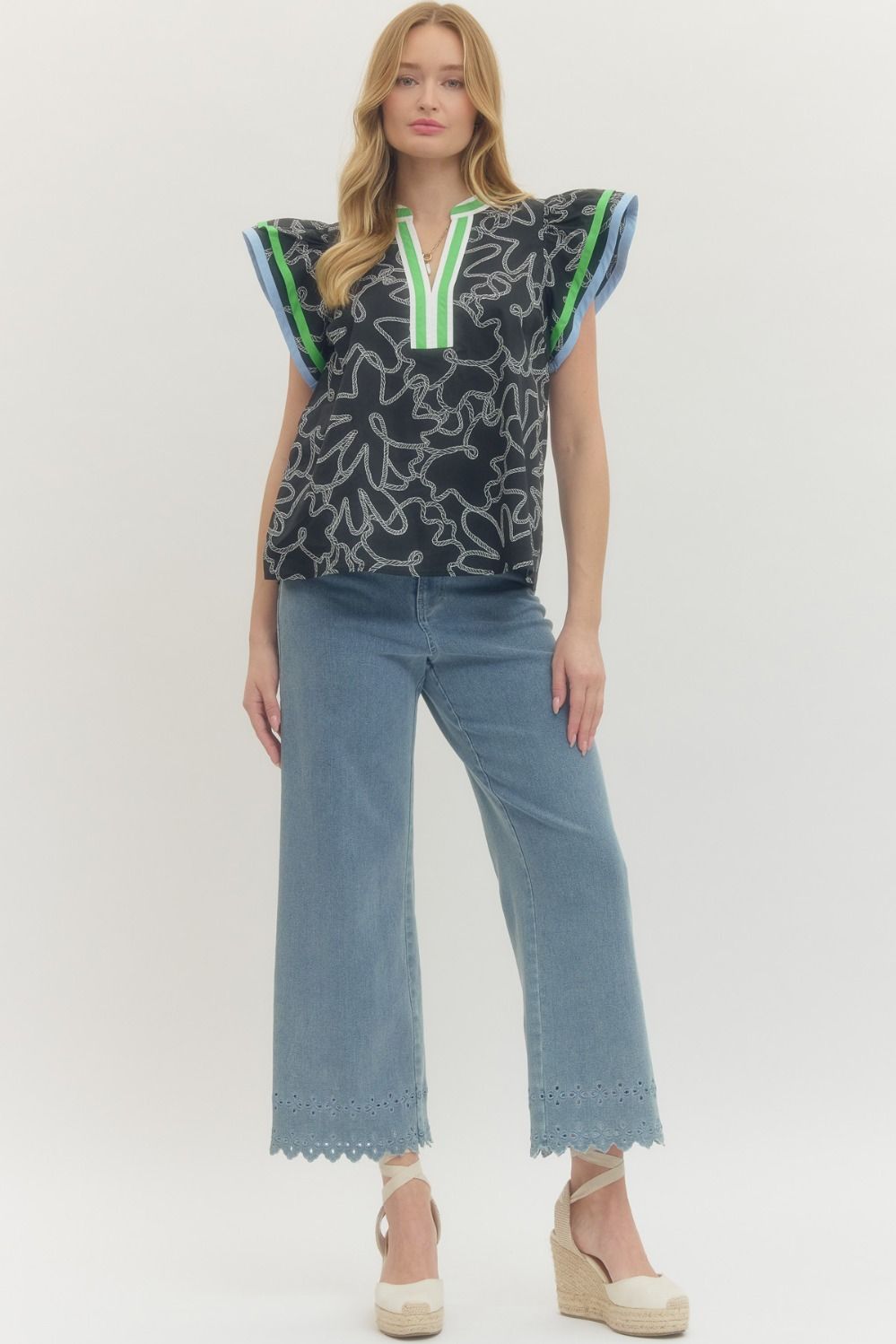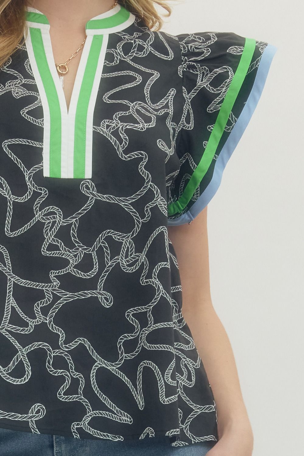 Abstract print flutter sleeve top featuring V-neck with multicolor striped trim detail. Unlined. Woven. Non-sheer. Lightweight. 100% Cotton