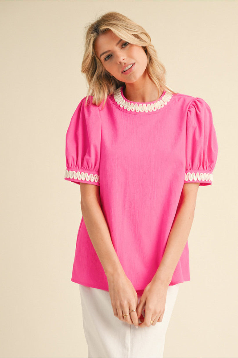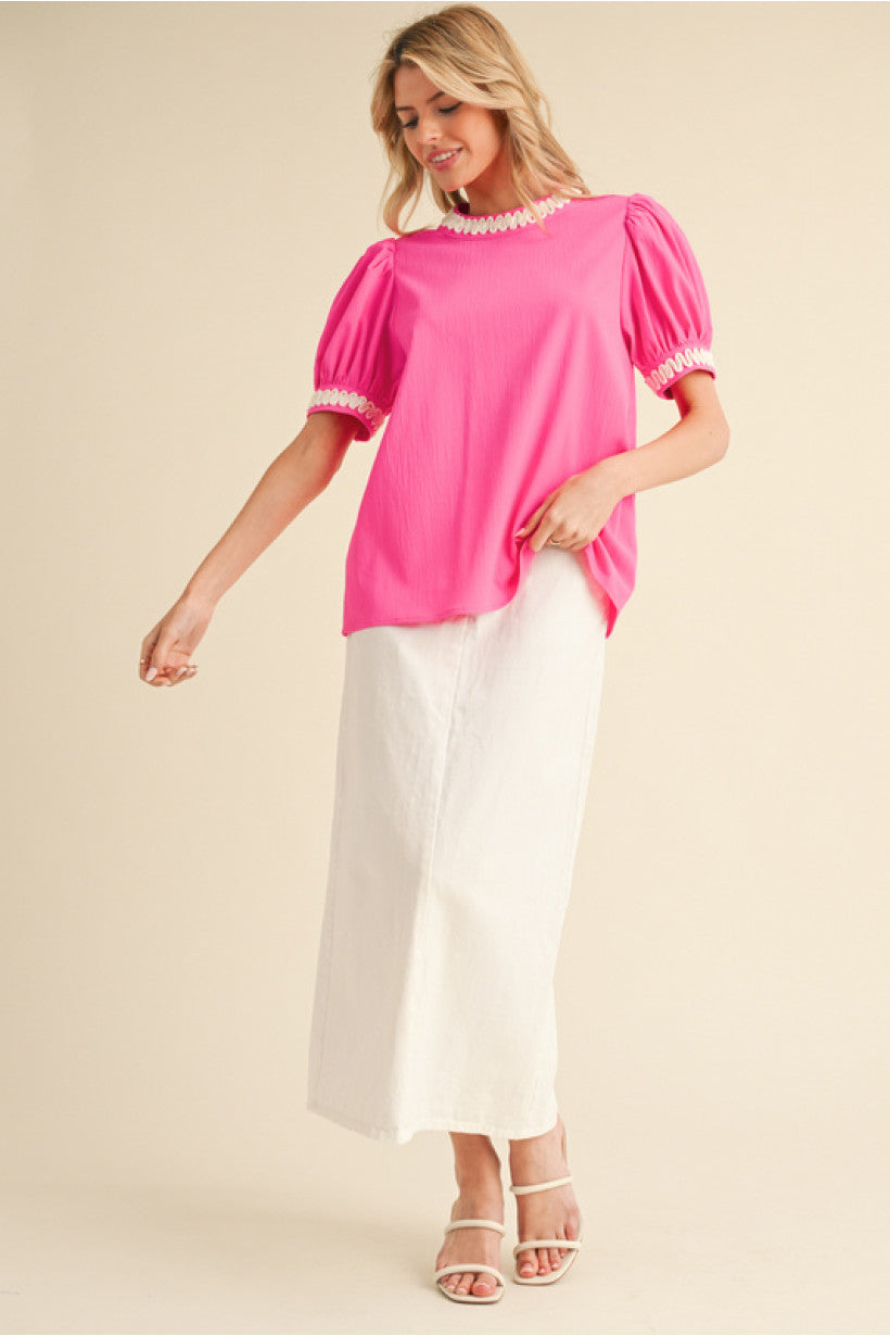 This solid U-neck top sets you apart with its puffed short sleeves, back key hole and buttoned cuffs. Made of non-sheer and lightweight material, its swirl color trimming edge adds a touch of style and sophistication.